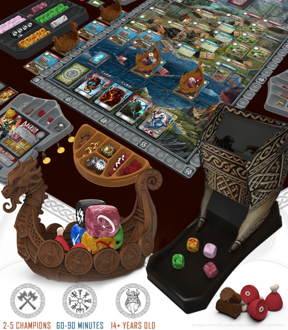 Champions of Midgard Worker-Placement-Spiel mit Wikinger-Thema und Würfelmechaniken. Die Spieler schlüpfen in die Rollen von Anführern rivalisierender Wikinger-Clans, die in eine belagerte Hafenstadt reisen, um sie vor gefährlichen Trollen, Draugr und anderen Kreaturen aus der nordischen Mythologie zu schützen. Wer diese mächtigen Gegner besiegt, sammelt Ruhm und die Gunst der Götter. Am Ende des Spiels wird derjenige mit dem meisten Ruhm zum Jarl ernannt und geht als wahrer Champion von Midgard in die Geschichte ein.