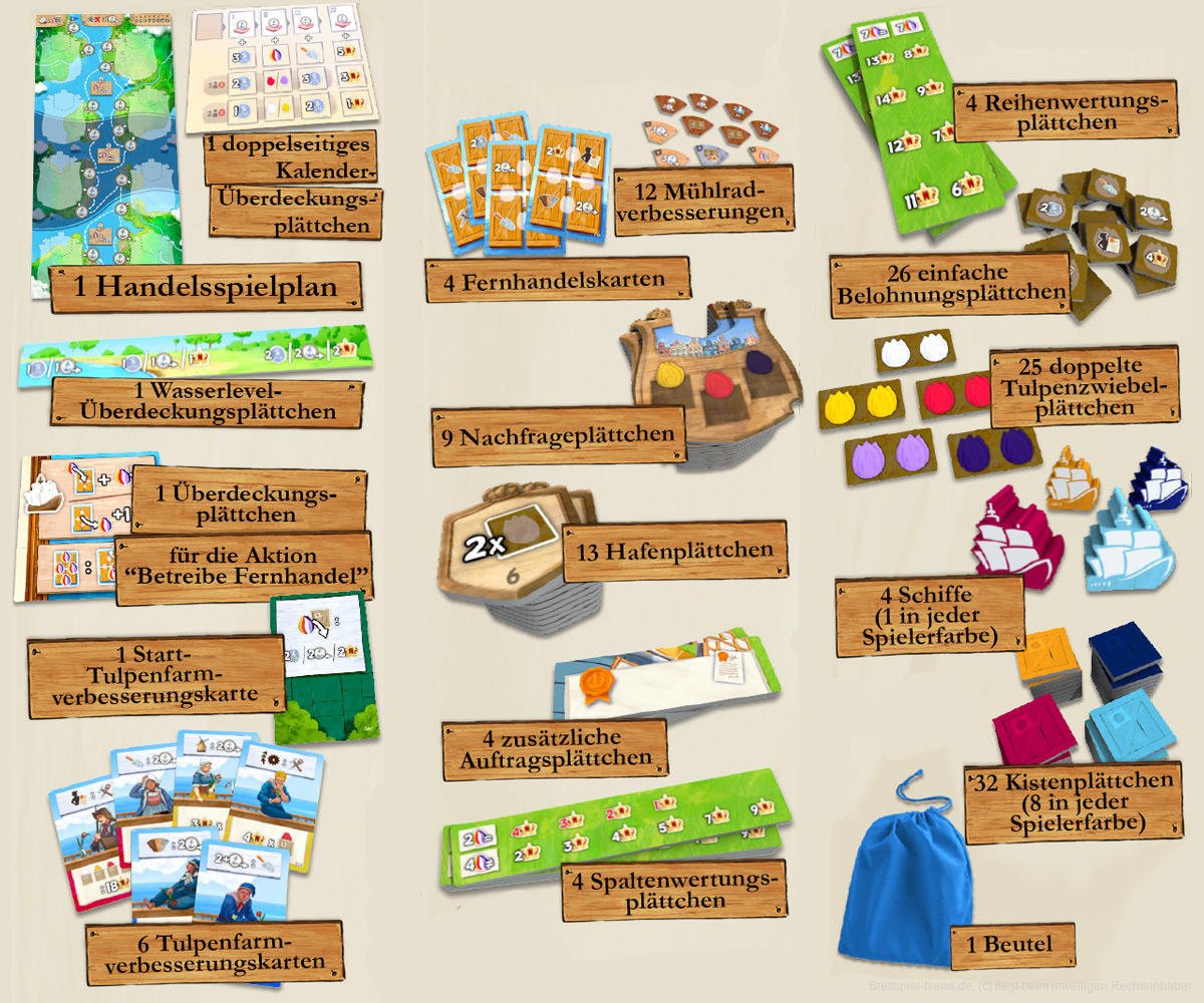 Die Erweiterung enthält reichlich Material: Neben einem neuen Handelsspielplan sind viele neue Karten und Plättchen, neue Mühlradverbesserungen, einige Überdeckungsplättchen und auch ein Beutel in der Box enthalten. Zusätzlich zur Erweiterung können auch diverse Mini-Erweiterungen oder ein Deluxe Tulpen-Set bestellt werden.