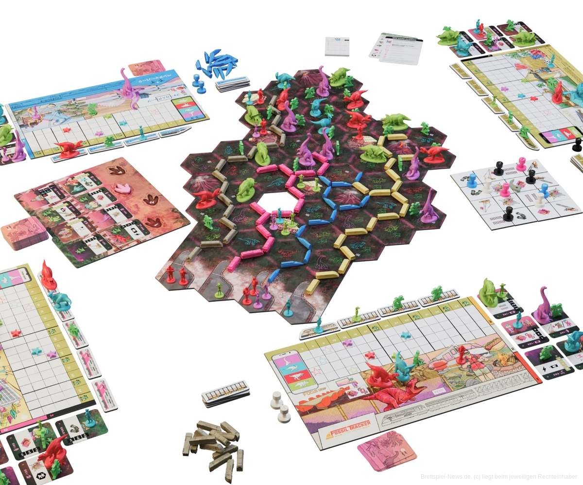 Cretaceous Rails kombiniert auf innovative Weise doppelte Arbeiter-Einsetzmechaniken, Streckenbau, Tableaubildung und Ressourcenmanagement. Nutze die Schätze des prähistorischen Dschungels, um das perfekte Zusammenspiel aus Attraktionen und Fähigkeiten zu schaffen und dir so den Weg zu möglichst vielen Punkten zu bahnen.