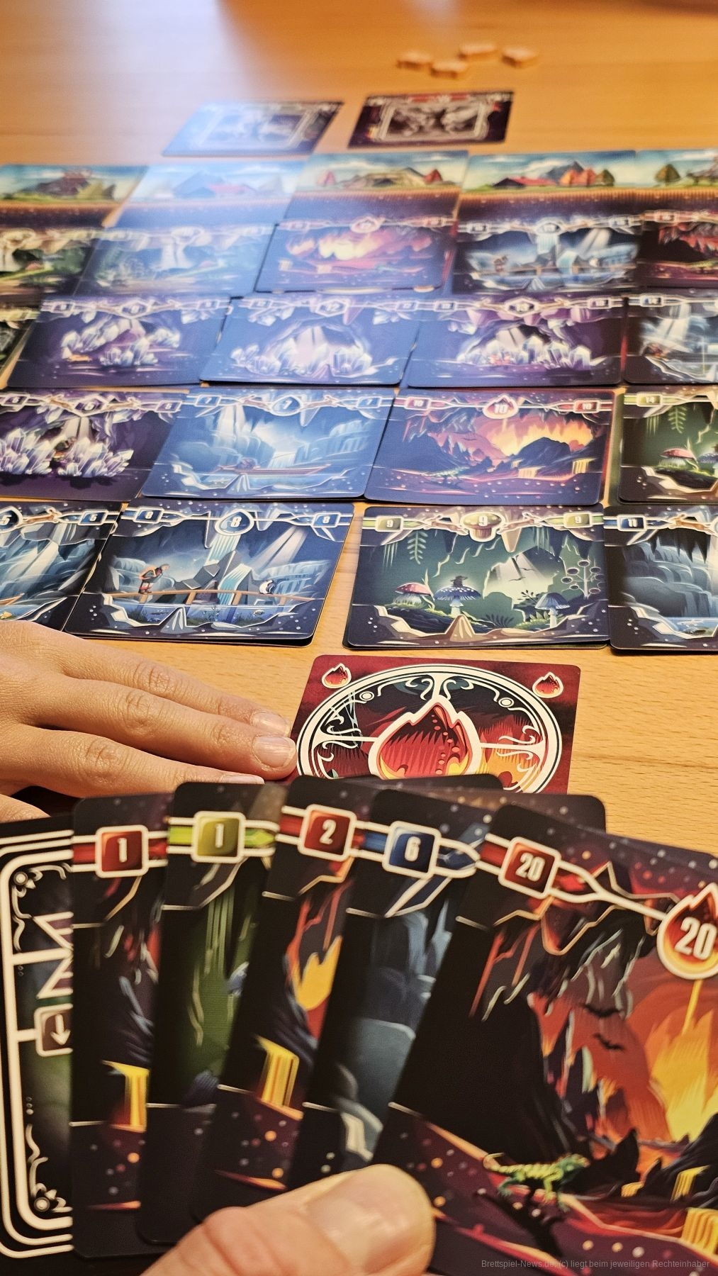Zudem setzt "Tranquility" auf eine zusätzliche Ebene, die interessante Entscheidungen erfordert. Bevor wir eine Karte mit ihrem Zahlenwert an eine Position spielen, müssen wir dort zunächst eine Karte derselben Farbe, also mit demselben Element, hinspielen. Somit müssen wir stets entscheiden, welche Zahlen wir verdeckt spielen, also als Grundlage für andere Zahlenkarten opfern.