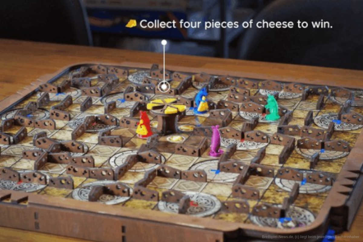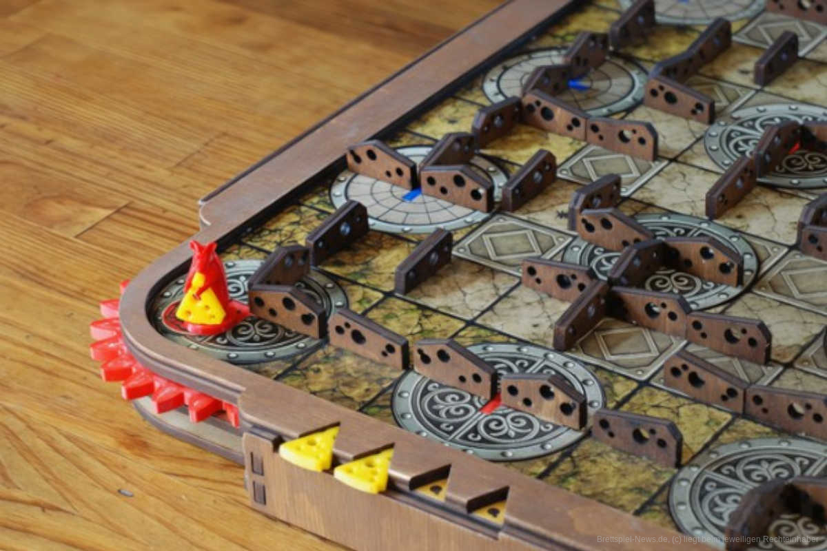 Etwas Besonderes ist auch die Tischpräsenz. Das Spielbrett ist 3-dimensional und aus Holz gefertigt. So laufen die Mäuse durch ein echtes Labyrinth. Laut Hersteller sind die Spiele händisch zusammengebaut, die Mechanik aus hochwertigen Materialien gedruckt. Die vier farbigen Mäuse sind liebevoll gestaltet und die Käsestücke zum Anbeißen.