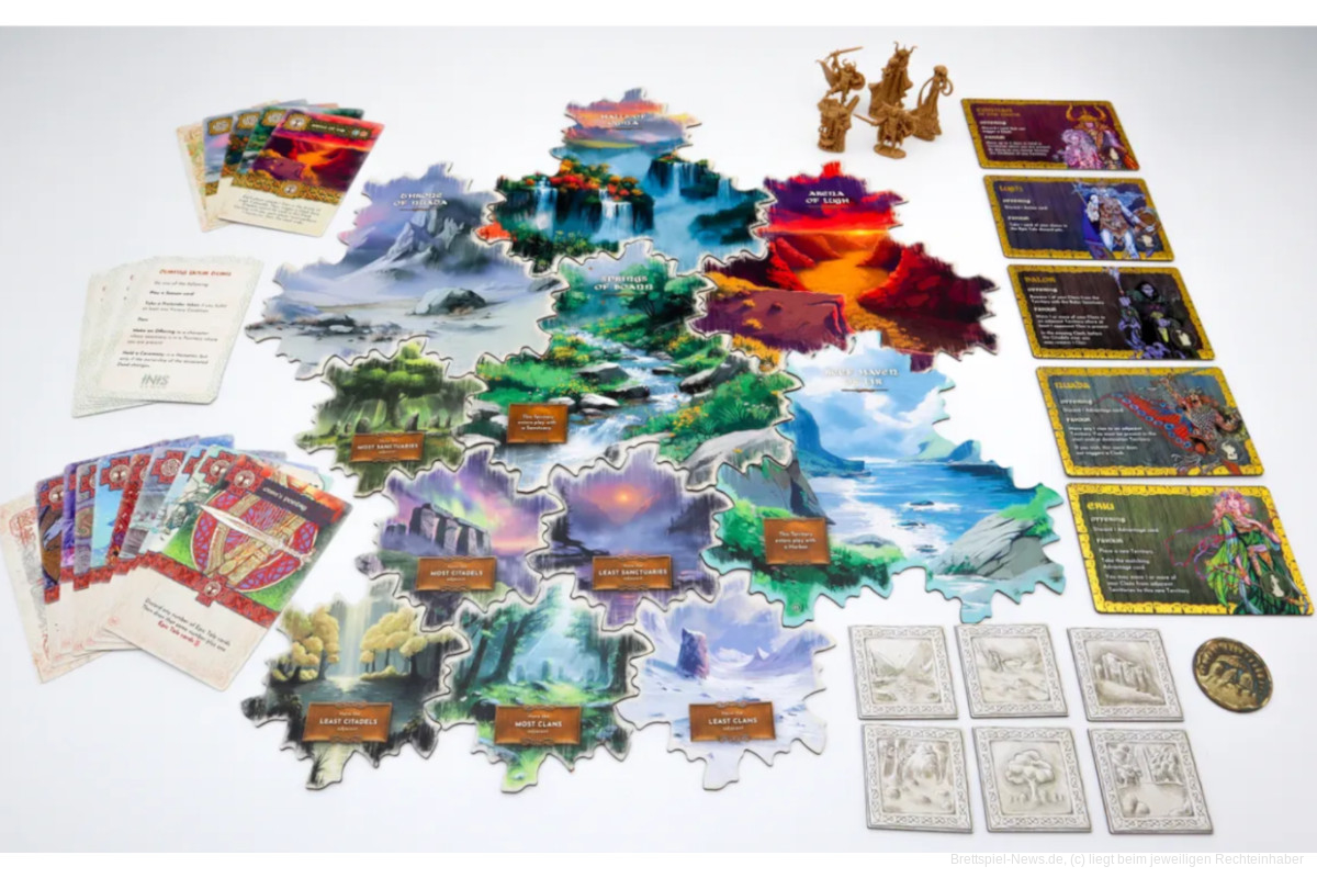 „Inis“ ist ein Area-Control Spiel für 2-4 Personen, das auch Elemente von Kartendrafting enthält. Als Häuptlinge eines keltischen Stammes wollt ihr euch beweisen und König werden. Das könnt ihr erreichen, indem ihr Gebiete kontrolliert, in denen andere Clans vertreten sind, eurer Clan weit verbreitet ist oder ihr in Bereichen präsent seid, die für die keltische Religion relevant sind.