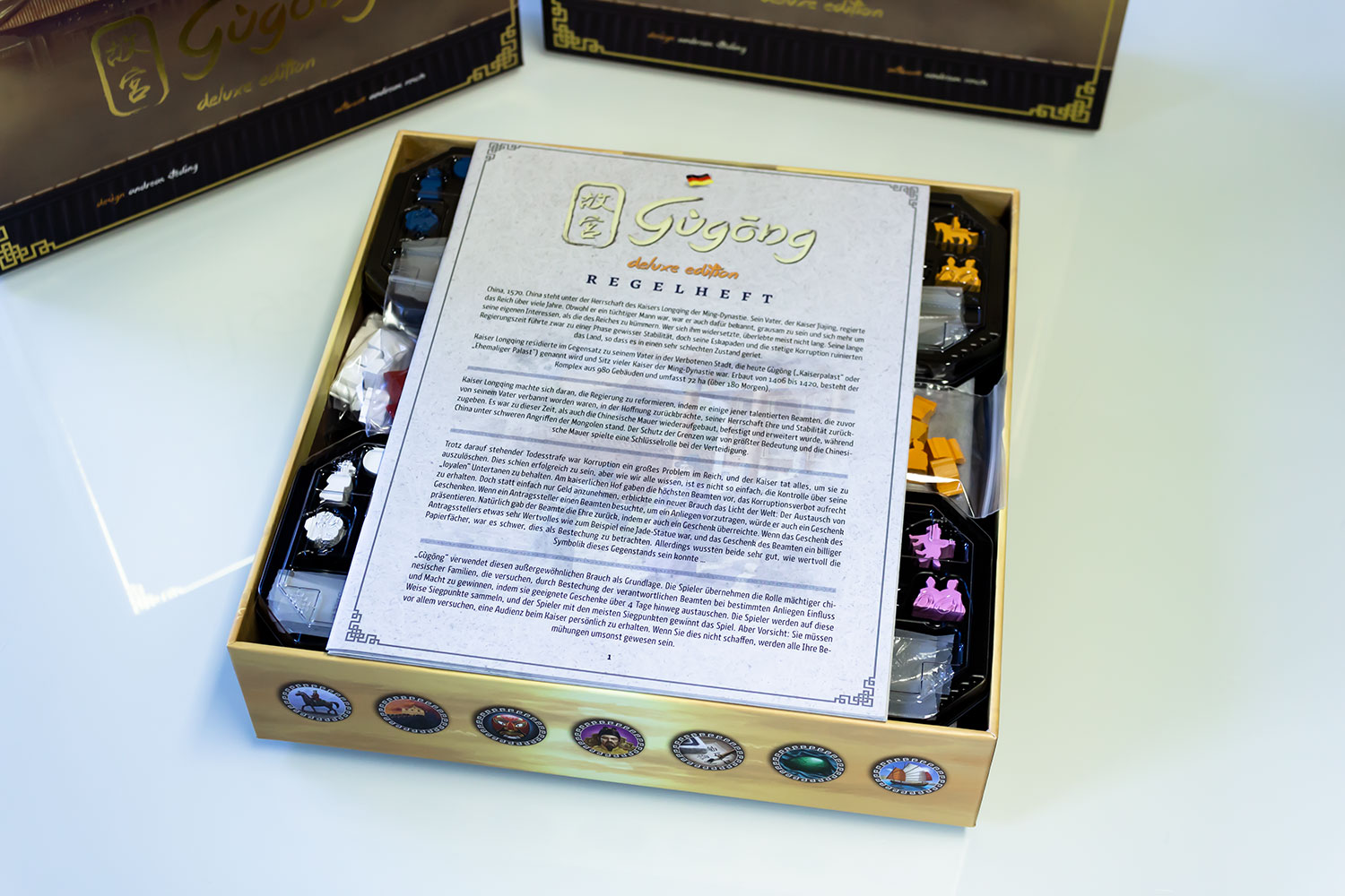 Die "Gùgōng" Kickstarter-Version ist nun ausgeliefert worden. Wir haben eine Deluxe-Version auf dem Tisch und zeigen das ausgesprochen hochwertige Spiel. Wir hatten selten ein so hochwertig produziertes Spiel auf dem Tisch. Hier ist alles bis in das Detail durchdacht. Die Macher versprechen ein cleveres, strategisches und dynamisches Spiel. "Gùgōng" ist ein Spiel für 1 bis 5 Spieler, Spieldauer ca. 20 bis 25 Minuten pro Spieler.