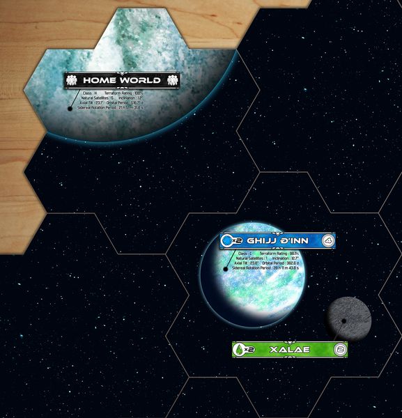 Eroberung // Geben Sie Imperiumspunkte aus, um Ihre Flotte zu bewegen, im Weltraum oder am Boden zu kämpfen, neue Sektoren zu erkunden oder benachbarte Planeten mit verheerenden Atomraketen zu vernichten. Jede Art von Kanone und Rakete wird durch einen einzigartigen Würfel repräsentiert.