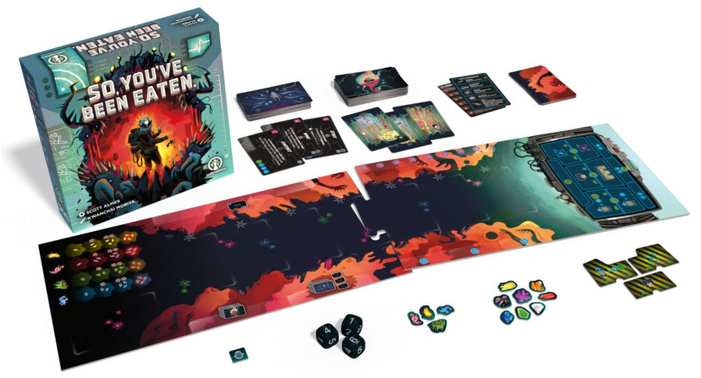 Nach TINY EPIC DUNGEONS ist mit SO, YOU'VE BEEN EATEN ein zweites Spiel von Autor Scott Almes (TINY EPIC Reihe, CLAIM) auf Kickstarter online. SO, YOU'VE BEEN EATEN ist ein asymmetrisches Dice Placement & Hand Management Spiel für null bis zwei Spieler:innen. Zu zweit steuert eine Person den Bergarbeiter, der Kristalle sammelt und die andere Person das Biest, das den Bergarbeiter gefressen und ihn nun mit Bakterien angreift, um ihn zu verdauen. Solo kann das Spiel sowohl als Bergarbeiter als auch als Biest gespielt werden. Außerdem könnt ihr die zwei Automas gegeneinander antreten lassen.
