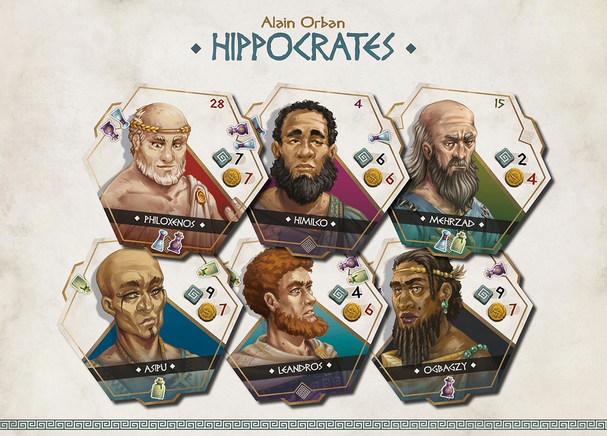 Hippocrates kombiniert Auktionen, Plättchen legen, Ressourcenmanagement und mehr, um eine aufregende Mischung zu erschaffen, die jeden Spieler herausfordert, seine Patienten bestmöglich zu versorgen und zu versuchen, Hippocrates' würdiger Nachfolger zu werden.