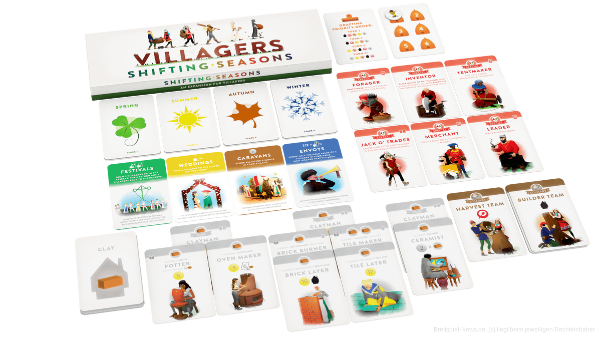 Derzeit läuft auf Kickstarter die Kampagne zu VILLAGERS: SHIFTING SEASONS von Sinister Fish Games. Es handelt sich um eine Erweiterung zu dem Grundspiel VILLAGERS, das in Deutschland beim Kosmos-Verlag im Jahr 2019 erschienen ist. In der modularen Erweiterung von Autor und Illustrator Haakon Gaarder, von dem auch die Grafiken und das Design des Grundspiels stammen, draften 1-5 Spielende mittelalterliche Dorfbewohner, um Produktionsketten zu vervollständigen und Gold zu verdienen. Die Spielzeit wird mit 30-60 Minuten angegeben.