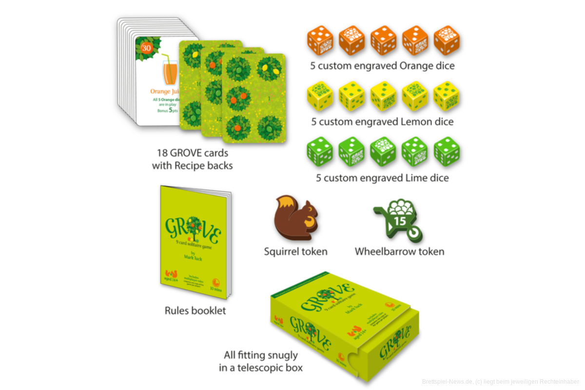 Die 18 Karten von GROVE zeigen Orangen-, Zitronen- und Limettenbäume, die passend aufeinandergelegt werden müssen. Als neues Element kommen Lichtungen ins Spiel. Durch diese baumfreien Flächen in Kombination mit einer neuen Wertungsmechanik gibt es mehr Möglichkeiten und Chancen, die Ernte zu steigern, und mehr Vielfalt im Spiel. Die Schubkarre ermöglicht dir, große Mengen zu sammeln; das freche Eichhörnchen kann dir entweder helfen, das Obst einzusammeln oder dich daran hindern.