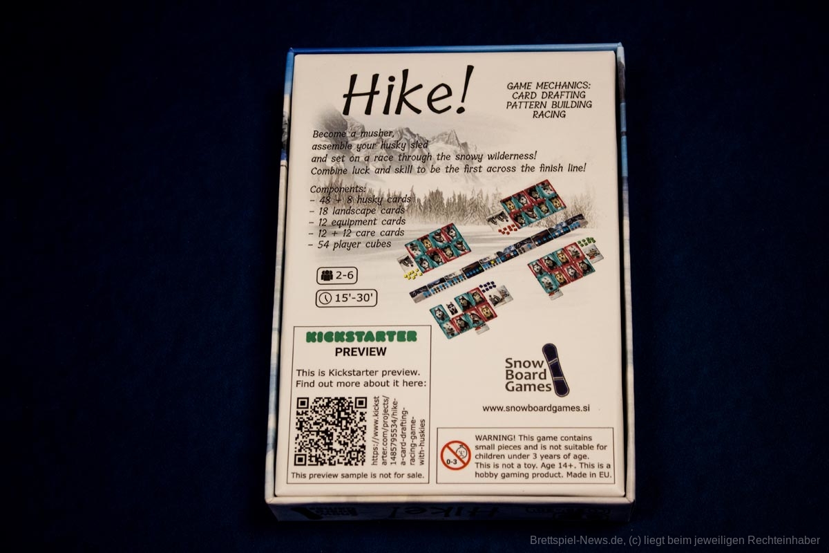 Mit „Hike!“ startet 2022 auf Kickstarter ein Kartenspiel, welches das Gefühl vom Führen eines Hundeschlittens vermitteln will. Es richtet sich an 2-6 Personen ab 8 Jahren und hat eine angepelite Spielzeit von 15-30 Minuten.