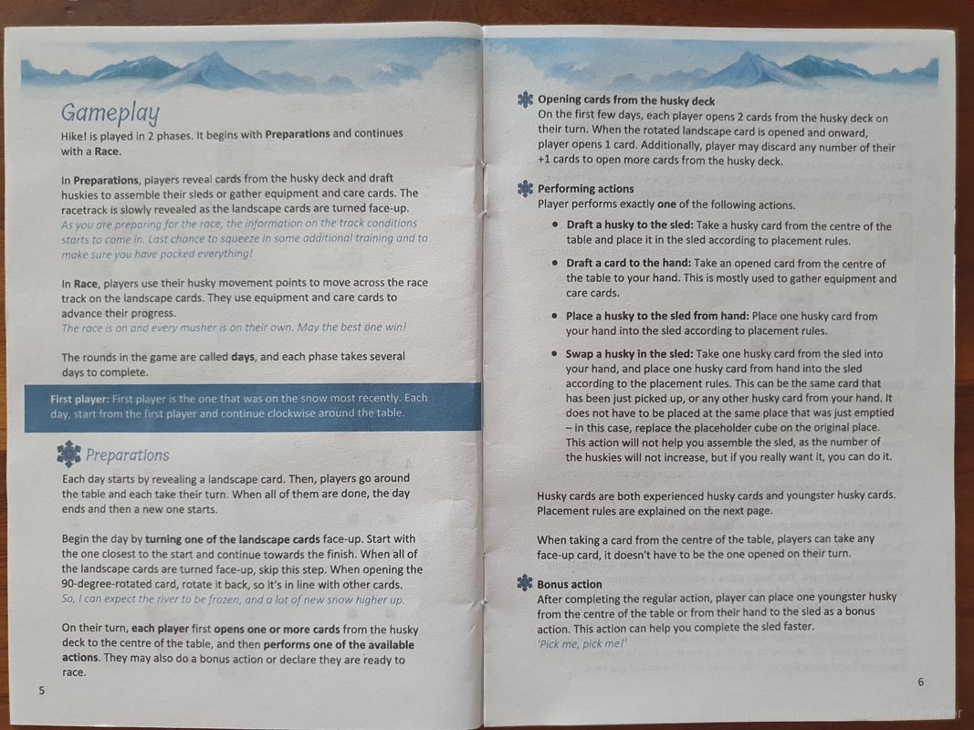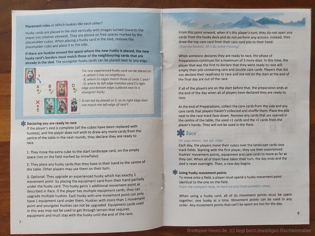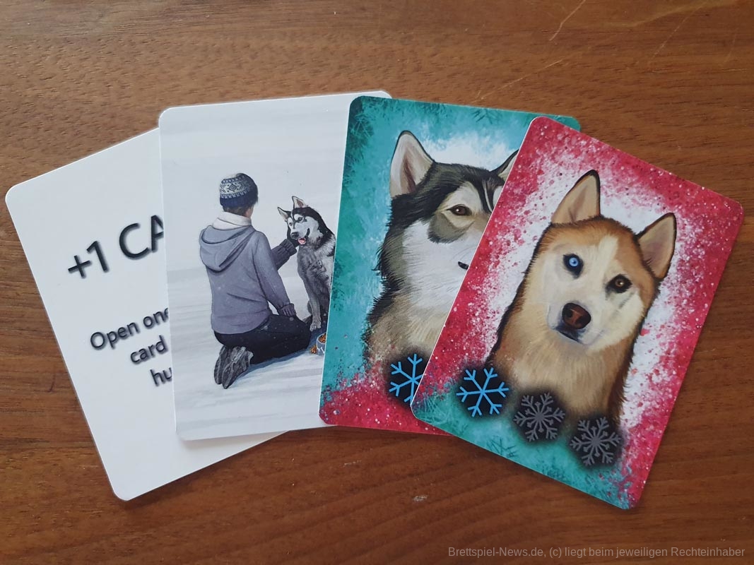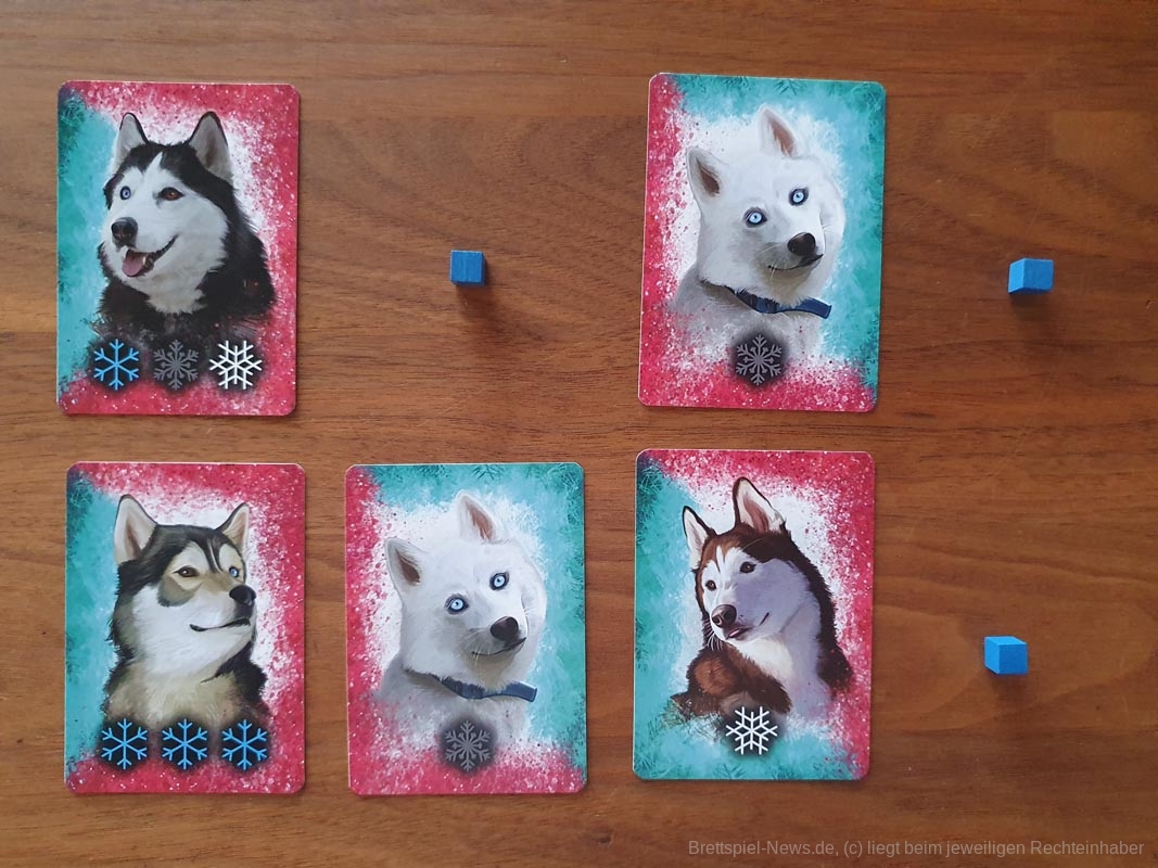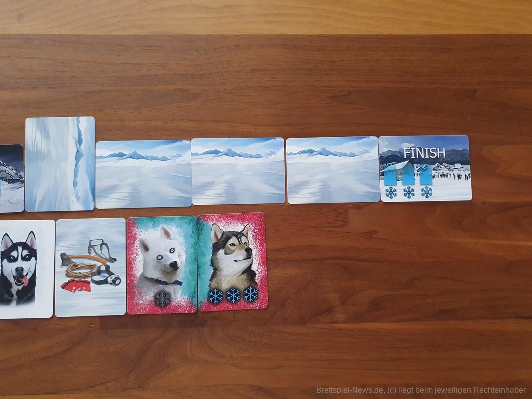Die Spieler wählen die Schlittenhunde sorgfältig nach ihren Fähigkeiten aus. Diese bewegen sich über unwegsames Gelände und werden von den Spielerinnen und Spielern entsprechend ihres Charakters in ihrer Schlittenposition eingesetzt. Sie sammeln Ausrüstung und trainieren ihre Huskys. Und dann geht das Rennen los! Die Spieler und Spielerinnen verlassen sich auf die Fähigkeiten ihrer Huskys und die Vorbereitungen, die sie getroffen haben, eine Kombination aus Glück und Geschick, die sie als erste über die Ziellinie bringt.