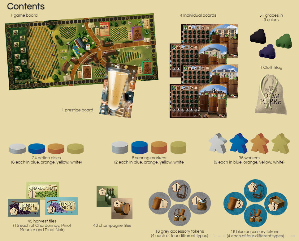 In Dom Pierre werdet ihr eure Weinberge bepflanzen, ernten und der Kellerei Champagner herstellen. Im Dorf kauft ihr Ernten von euren Nachbarn, erwerbt Zubehör zur Verbesserung der Produktion, erhaltet Boni oder Siegpunkte. Es ist ratsam, sich auf die Logistik des Unternehmens zu konzentrieren, indem ihr Verkäufer für die Marktrouten und Arbeiter für den Weinberg und die Kellerei bereitstellt. Mit dem gewinnbringenden Verkauf des Champagners verdient ihr Siegpunkte und Geld, und zusätzlich könnt ihr Ziele erwerben, die in Siegpunkte umgewandelt werden können, wenn die Ziele erreicht werden. Neben diesen Aktionen könnt ihr euer Prestige, das ihr durch den besten Champagner, die Leistungsfähigkeit des Kellers und euren Reichtum erlangt, in noch mehr Siegpunkte umwandeln.