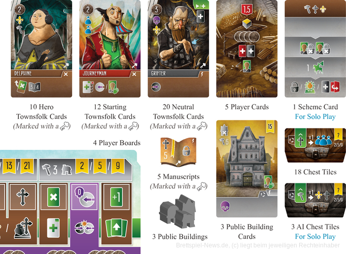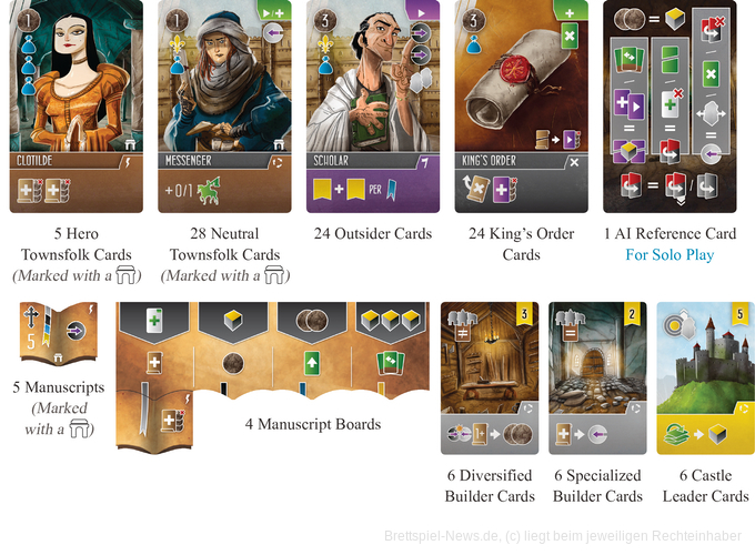 - weitere Castle Leader, Townsfolk und Builder Bonus Cards sowie Manuskripte, die mehr Abwechslung ins Spiel bringen
