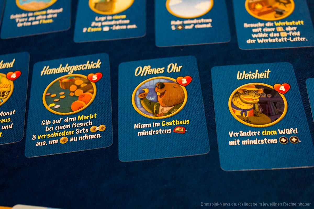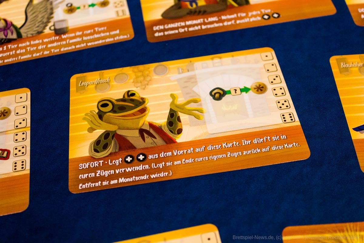 Bevor du deine Tiere zur Arbeit schickst, in der Hoffnung, später die für den Erfolg benötigten Würfel zu erhalten, würfelt ihr jeweils zwei eigene Familienwürfel. Auf diese Weise habt ihr schon vor dem Einsetzen der Tiere und dem Würfeln der vier gemeinsamen Würfel ein wenig Vorwissen über die später verfügbaren Würfelaugen.