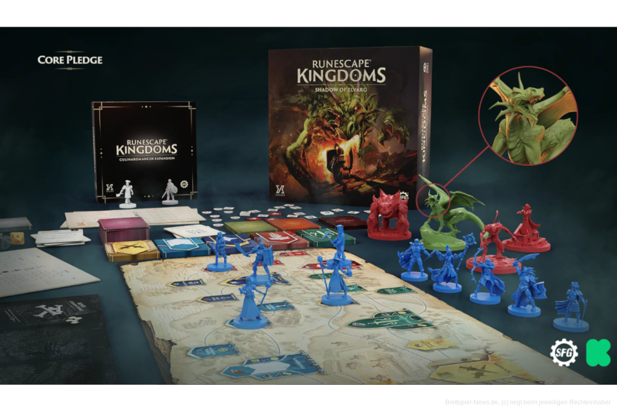 Im Core Pledge erhaltet ihr das Grundspiel „Runescape Kingdoms: Shadow of Elvarg“ und die KS-exklusiven Spielinhalte der „Culinaromaner“-Erweiterung. Diese enthält die Culinaromancer-Boss-Kampagne und einen NPC. Der Preis liegt bei 65£ (ca. 76€), laut Angaben von SFG entspricht das einem Rabatt von ca. 40€ zur Retail-Version. Insgesamt erhaltet ihr an Material 16 Miniaturen und 400 Karten. Die Gesamtspieldauer liegt bei 15h, es soll aber eine hohe Wiederspielbarkeit vorliegen.