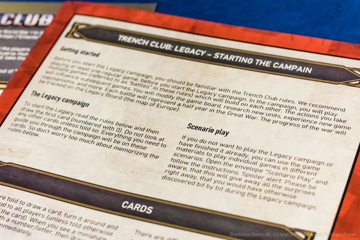 In „Trench Club: Legacy“ können 1-5 Personen über zehn Szenarien hinweg den Verlauf des ersten Weltkrieges verändern. Das geht sowohl kooperativ als auch kompetitiv. Die Spielzeit beträgt rund eine Stunde pro Person, es darf sich auf längere Spielabende eingestellt werden.
