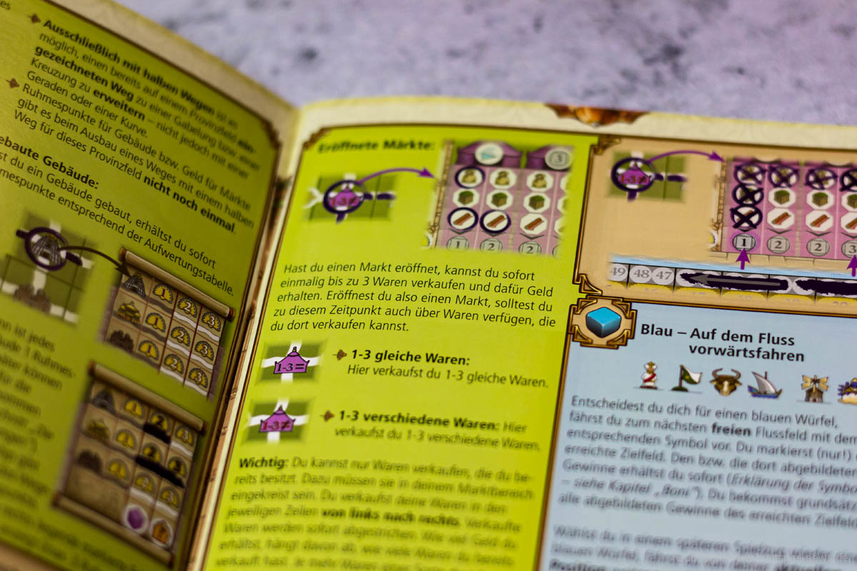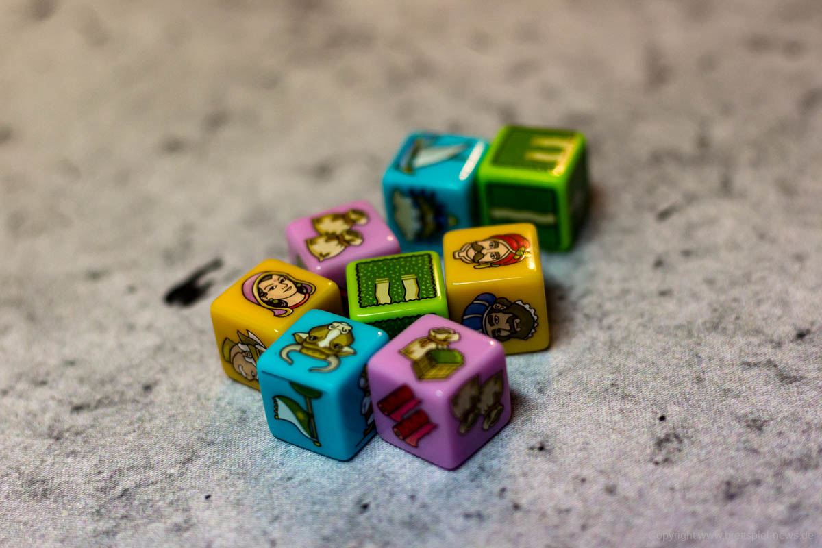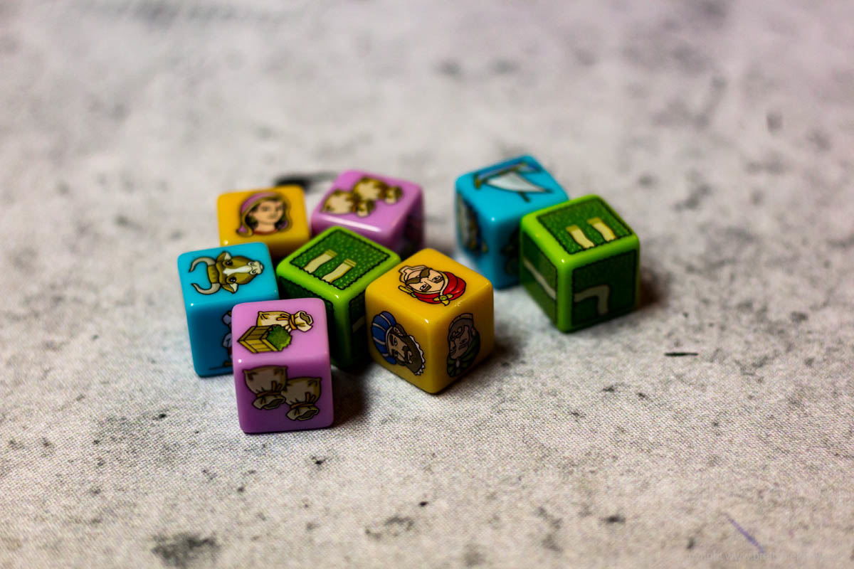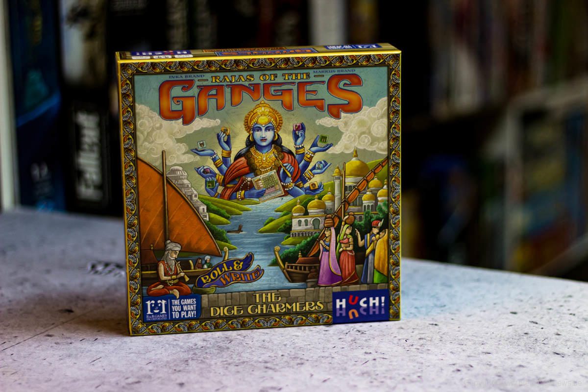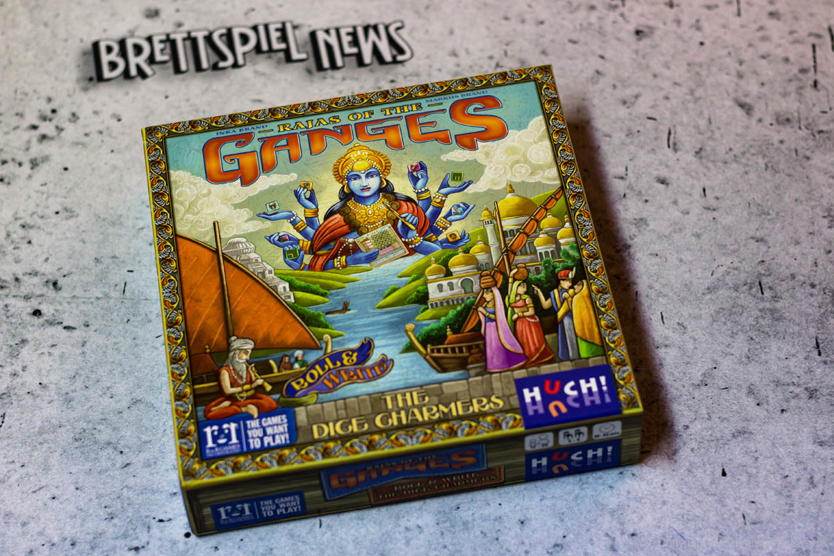Mit RAJAS OF THE GANGES – THE DICE CHARMERS hat HUCH! eine kleine Herbstneuheit mit großer Vorlage erschienen. Das beliebte Spiel RAJAS OF THE GANGES wurde von den Erfolgsautoren INKA und MARKUS BRAND erdacht und von ihnen stammt nun auch die neue Version des Spiels. Der Preis wird nur bei etwas über 16,50 € liegen, die Packung enthält dafür sehr viel Inhalt, wie in unseren Bildern zu sehen ist. Einzigartige Würfel, zwei große Spielblöcke und einige Marker aus Pappe.