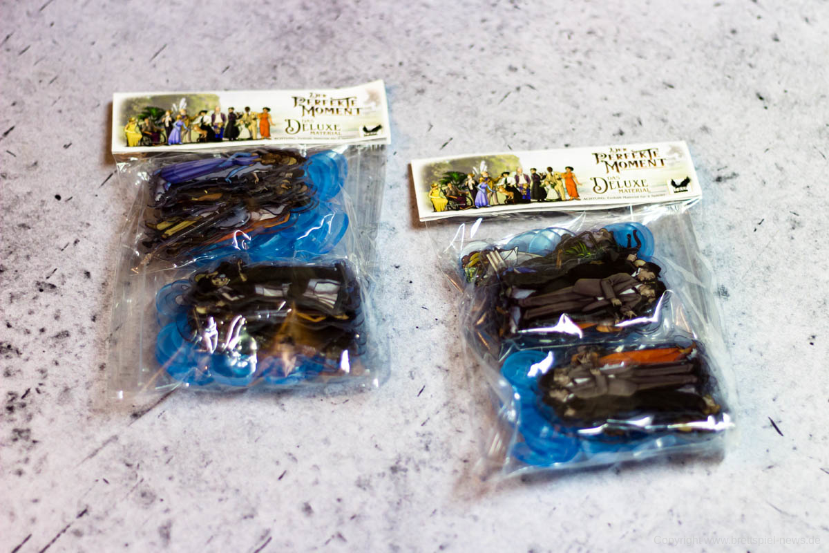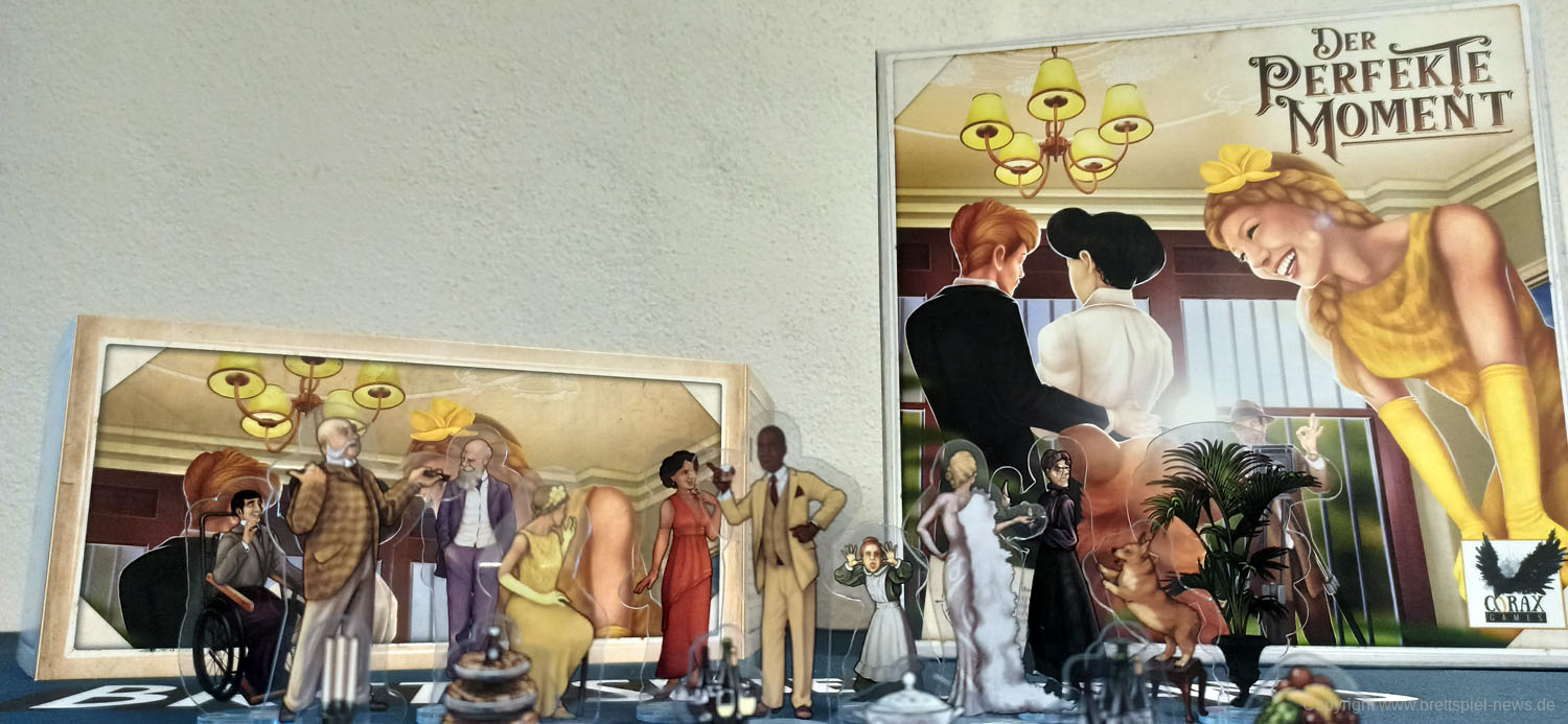 DER PERFEKTE MOMENT ist nun ausgeliefert worden. Bei uns zu sehen ist die Retail-Version des Spiels inkl. Deluxematerial, was separat käuflich zu erwerben ist. Es handel sich dabei um transparente Acryl-Figuren, die im Grundspiel aus Pappe enthalten sind. Das extra ist definitiv nicht nötig um das Spiel zu speilen, sondern für Sammler und Liebhaber gedacht. Das Familienspiel ist bei CORAX GAMES erschienen und ist eine Eigenproduktion des Verlages. Es stammt vom Autor ANTHONY NOUVEAU, die Grafik wurde vom TRIO MAJA WRZOSEK, SÖREN MEDING und Gyula Pozsgay erstellt. Das Spiel ist mit 2-4 Spielern spielbar.