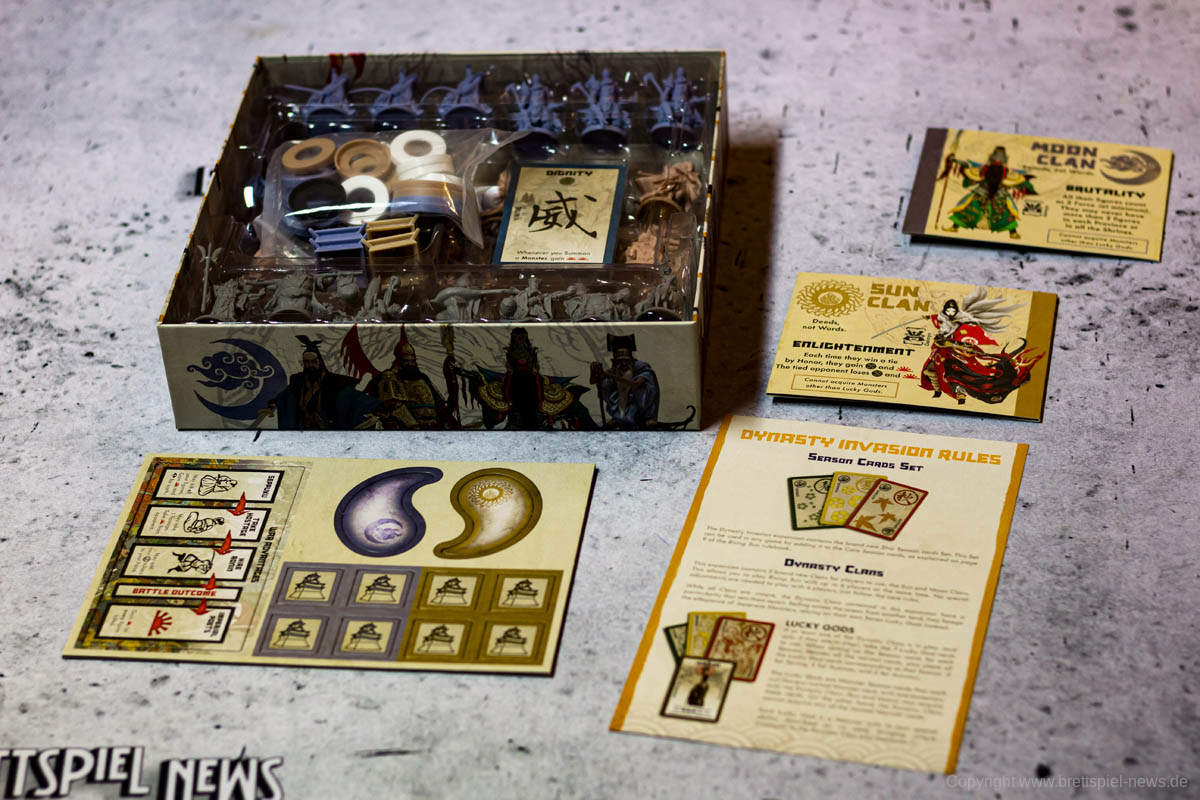 Um die Dynastie Invasion Erweiterung zu nutzen sind keine besonderen Anpassungen notwendig, es gelten die normalen Regeln des Grundspiels. Neue Saisonkarten werden ebenfalls hinzugefügt und können jederzeit verwendet werden. Mit den neuen Klans, Monstern und Jahreszeiten werdet Ihr Rising Sun wie nie zuvor erleben.