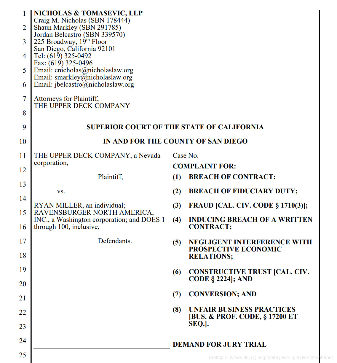 CARLSBAD, CA (07. Juni 2023) - Upper Deck, der weltweit führende Anbieter von Sport- und Unterhaltungsspielen und Sammlerstücken, verklagt Ravensburger und einen früheren Spieleentwickler von Upper Deck wegen Diebstahls und Kopierens des Originalspiels von Upper Deck, das Ravensburger neu verpackt und als Lorcana vermarktet hat.