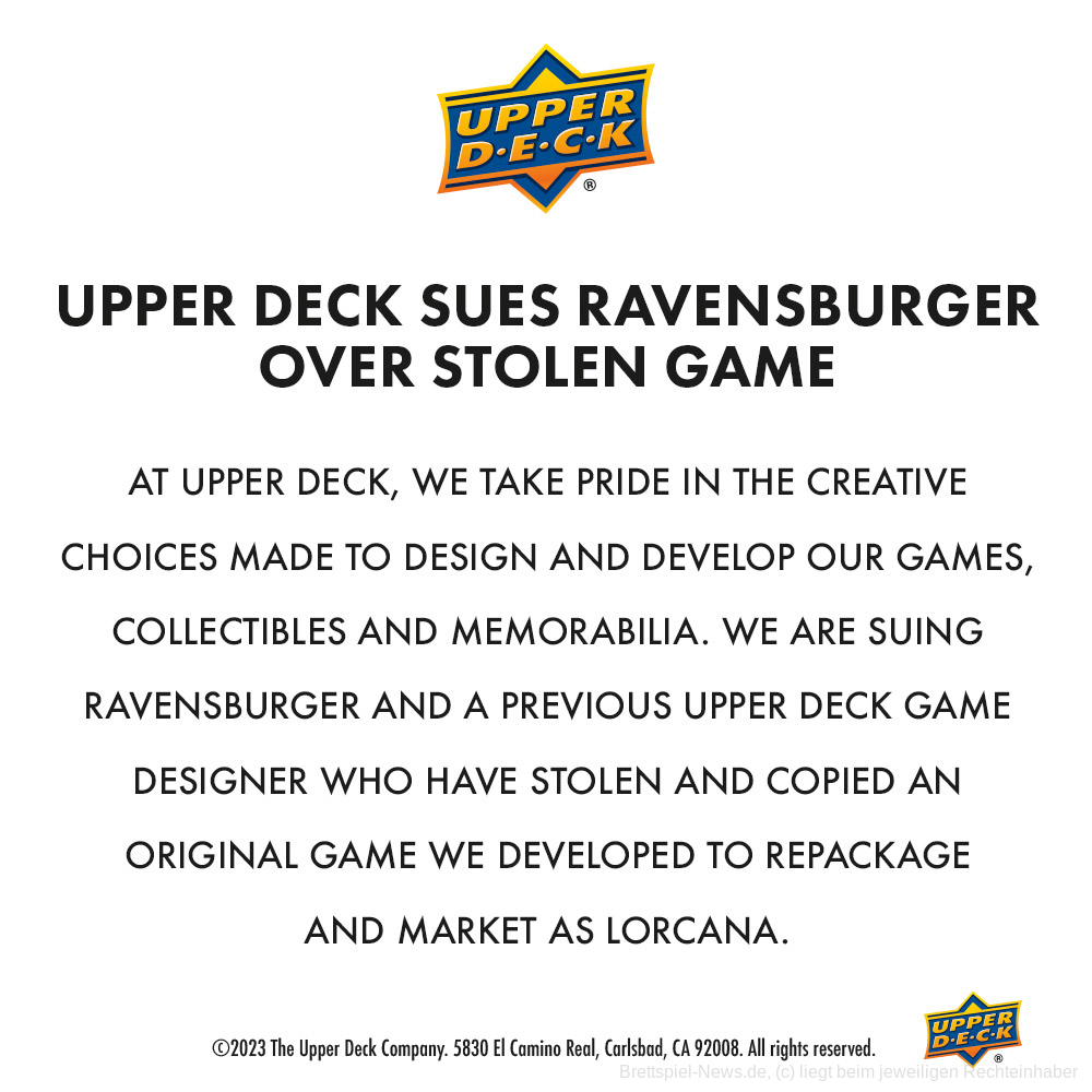 Das amerikanische Unternehmen Upper Deck kündigte am 7.6.2023 an, Ravensburger wegen des neuen erst noch erscheinenden Spiels „Disney Lorcana“ vor einem Gericht in Kalifornien verklagen zu wollen. Es sei laut Upper Deck ein „gestohlenes Spiel“ das Ravensburger nun weltweit vermarkten wolle.