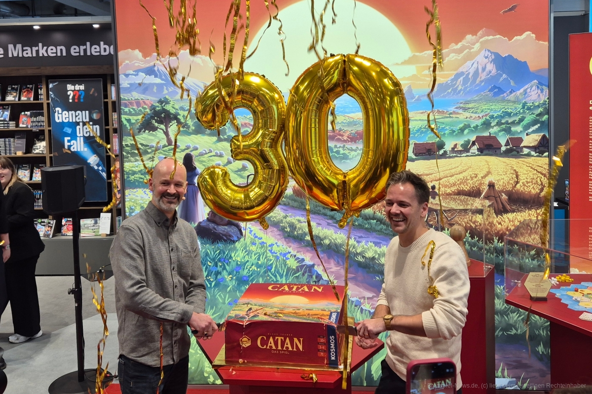 Auch Kosmos hatte wieder was zu feiern: Schon 30 Jahre ist es her, dass die „Siedler von Catan“ (heute nur noch „Catan – Das Spiel“) das Gesellschaftsspiel revolutionierte und vielen Spielerinnen und Spielern den Weg ins Vielspiel-Hobby ebnete. Aus diesem Anlass, werden das Grundspiel und dutzende Erweiterungen in neuem Gewand aufgelegt. Die erfolgreiche Catan-Reihe hat sich mit mittlerweile über 45 Millionen Exemplaren beachtlich verkauft. Auf der Nürnberger Spielwarenmesse wurde der 30. Geburtstag und der grandiose Erfolg von Catan gebührend von Kosmos und den Geschäftsführern der Catan GmbH, Benjamin und Guido Teuber, gefeiert.