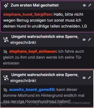 Meeple Porn ist einer von Deutschlands größten Brettspielpodcast. Gewöhnlich wird jeden Donnerstag die neue Podcastfolge aufgenommen, welche aber auch live via Twitch gestreamt und verfolgt werden kann. Zum Ende des Streams geschah es dann, dass bei einem der Streamer in sehr kurzer Zeit sehr oft geklingelt wurde und Lieferanten vor der Tür standen. Angeblich wurde über Lieferando mehrmals auf den Namen des Streamers Essen bestellt, welches natürlich im Vorfeld nicht bezahlt wurde. Zu erwähnen ist noch, das der betroffene Streamer schon seit längerer Zeit vegan lebt, die Bestellungen, wie unter anderem ein Dönerteller aber sehr weit weg vom Veganismus waren. Parallel dazu schalteten sich in den Livestream von Twitch neue Follower hinzu, die direkt an ihren sehr provokanten Usernamen erkennbar waren. Diese Beleidigten den Streamer nicht nur, sondern drohten auch mit Mord an dessen Hund oder Sachbeschädigung (siehe Bild).