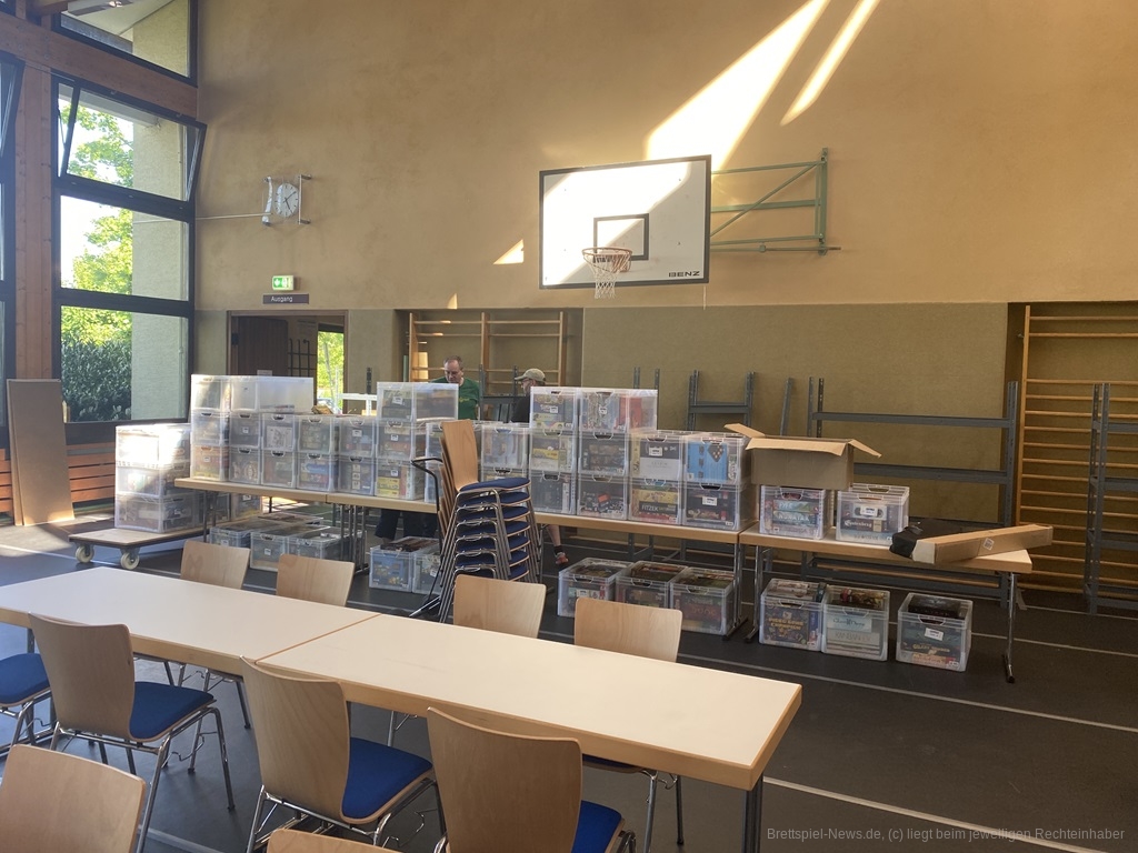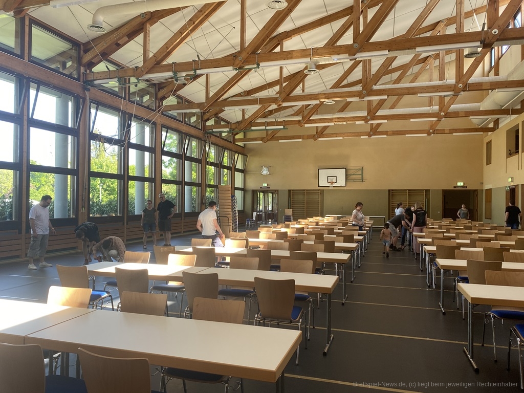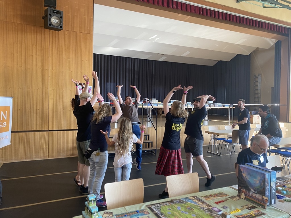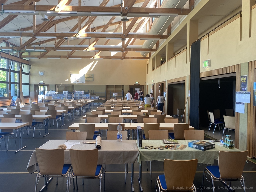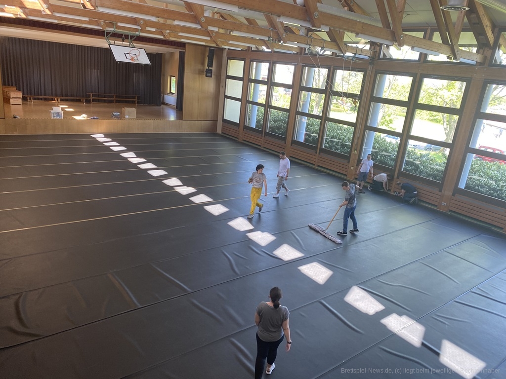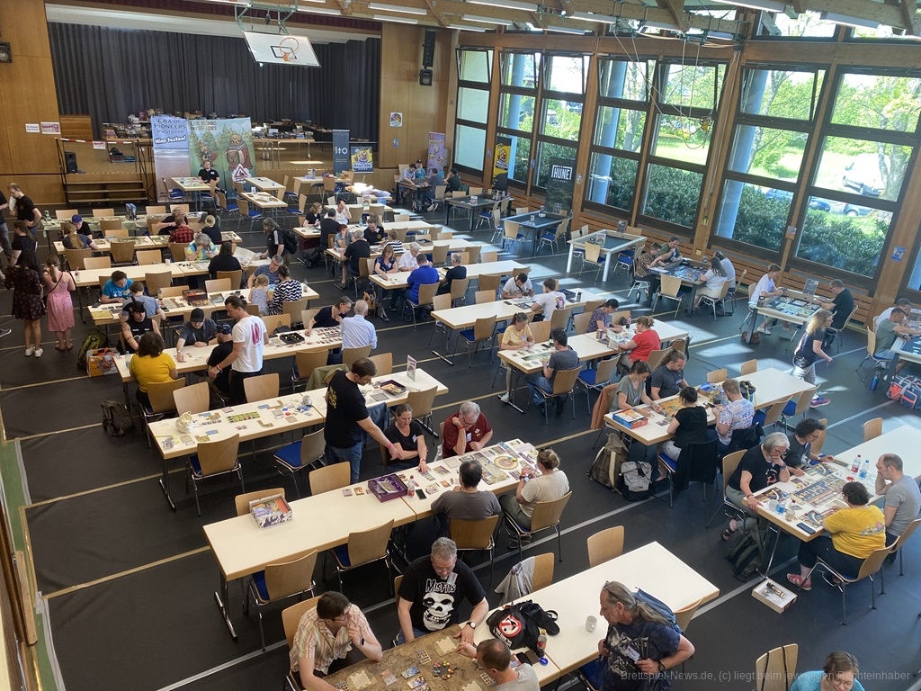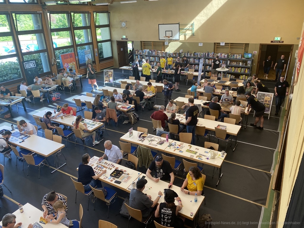 Für den Auf- und Abbau, sowie diversen Arbeiten hinter den Kulissen waren ca. 25-30 freiwillige Helfer beschäftigt. Hallenboden auslegen, Tische und Stühle tragen, Essen kochen und Räume dekorieren stand am 1. Mai auf dem Plan, damit sich die Tore der neuen Konvention am darauffolgenden Morgen öffnen konnten. Da es sich um einen Brückentag handelte, war der Besucheransturm von 130 Spielern und Spielerinnen bereits recht hoch. Die angemietete Sporthalle konnte am Samstag mit knappen 200 Besuchern aber nochmal deutlich stärker gefüllt werden. Und auch am Sonntag waren über 150 Menschen begeistert dabei, Pöppel und Meeple über die Spielbretter zu schubsen.