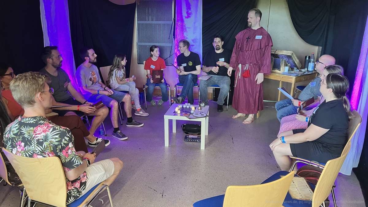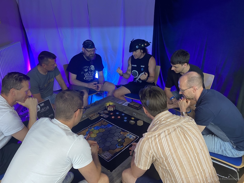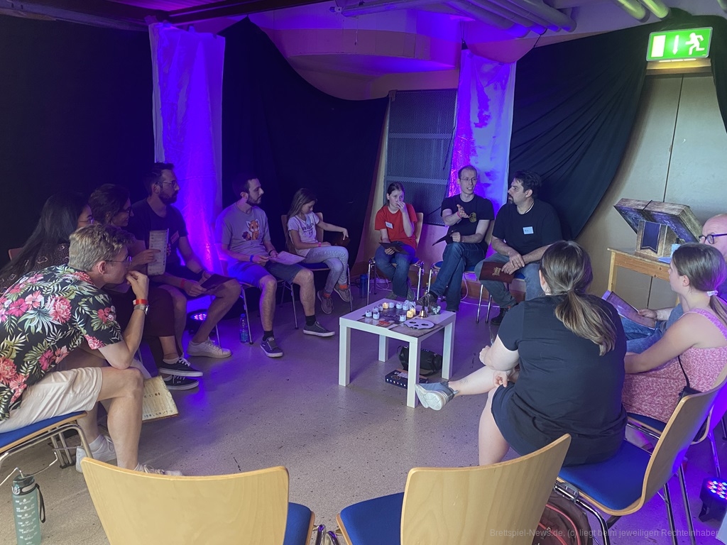 Im Nebenraum fanden in der Zwischenzeit „Blood on the Clocktower“ Runden statt, die von zwei Spielleitern im Wechsel geleitet wurden. Stimmungsvolle Dekoration und Beleuchtung, sowie Musik stimmten auf die düsteren Machenschaften des Dämons ein. Auch aus diesem Raum konnte ich keine negativen Stimmen vernehmen. Einige Spieler kamen sogar öfter vorbei und versuchten ihr Glück mit einer neuen Dorfgemeinde.