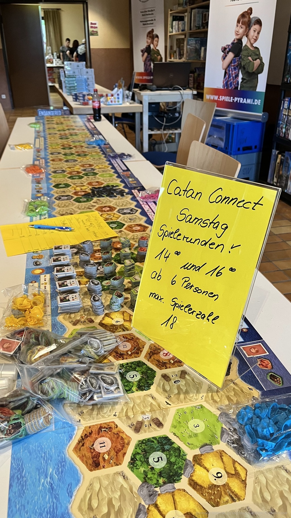 Vor den Hallen stellte der Karlsruher Spielehändler „Spiele-Pyramide“ seine Verkaufstische auf. Auf der Länge von zwei Festzeltgarnituren wurden „Catan Connect“ Spielrunden für bis zu 10 Spieler angeboten. Daneben ist Inhaber „Thorsten“ auch Mitbegründer des „10 Traders“ Verlags, der ebenfalls seine Spiele vorstellte.