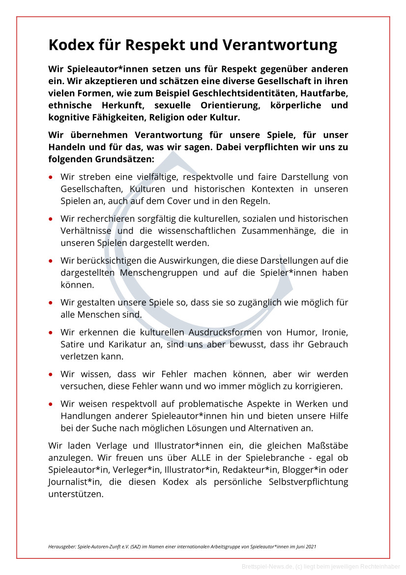 Eine internationale Gruppe von Spieleautor:innen hat, initiiert von der Spiele-Autoren-Zunft (SAZ), einen Kodex für Respekt und Verantwortung erstellt. Zu den 75 Erstunterzeichner:innen gehören Autor:innen und Illustrator:innen, die zum Teil in der Spiele-Autoren-Zunft oder der Société des Auteurs de Jeux (SAJ) organisiert sind.
