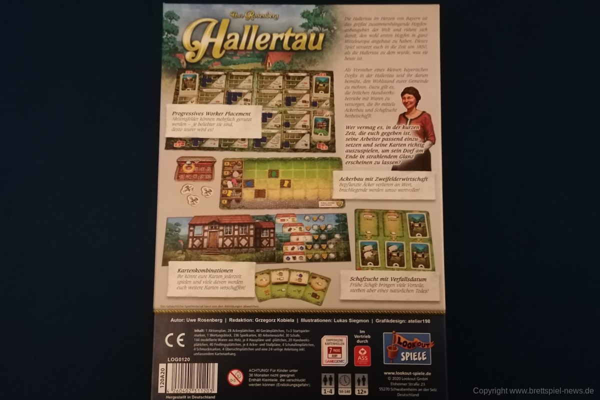 Zur SPIEL.DIGITAL erschien neben den beiden Puzzlespielen SAGANI und NEW YORK ZOO das neue große Spiel von Uwe Rosenberg. HALLERTAU ist ein Spiel für ein bis vier SpielerInnen ab 12 Jahren. Eine Partie dauert zwischen 50 und 140 Minuten. Lukas Siegmon hat das Spiel illustriert. HALLERTAU ist bei LOOKOUT SPIELE erschienen und die UVP liegt bei 75,99 €.