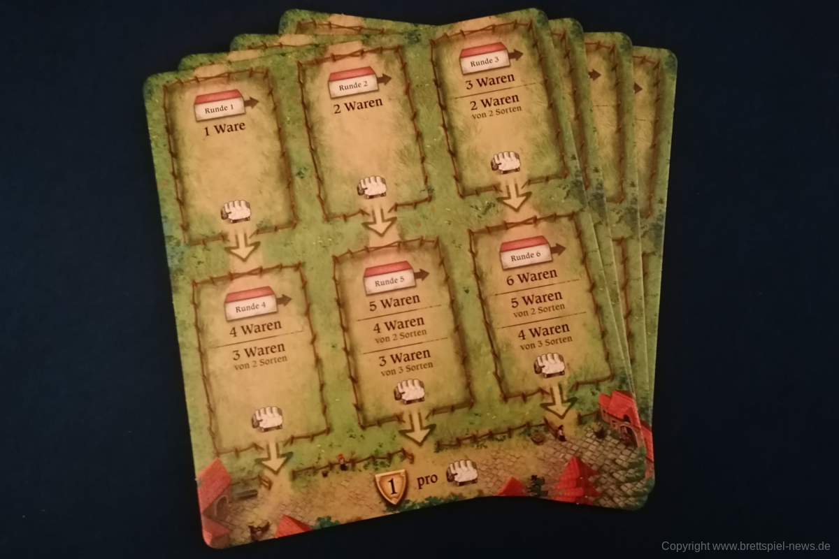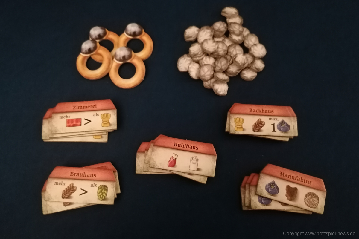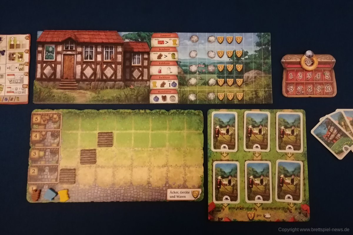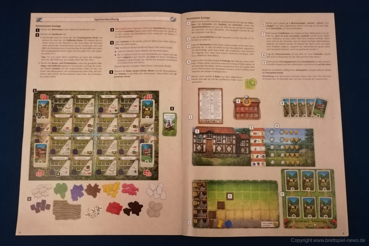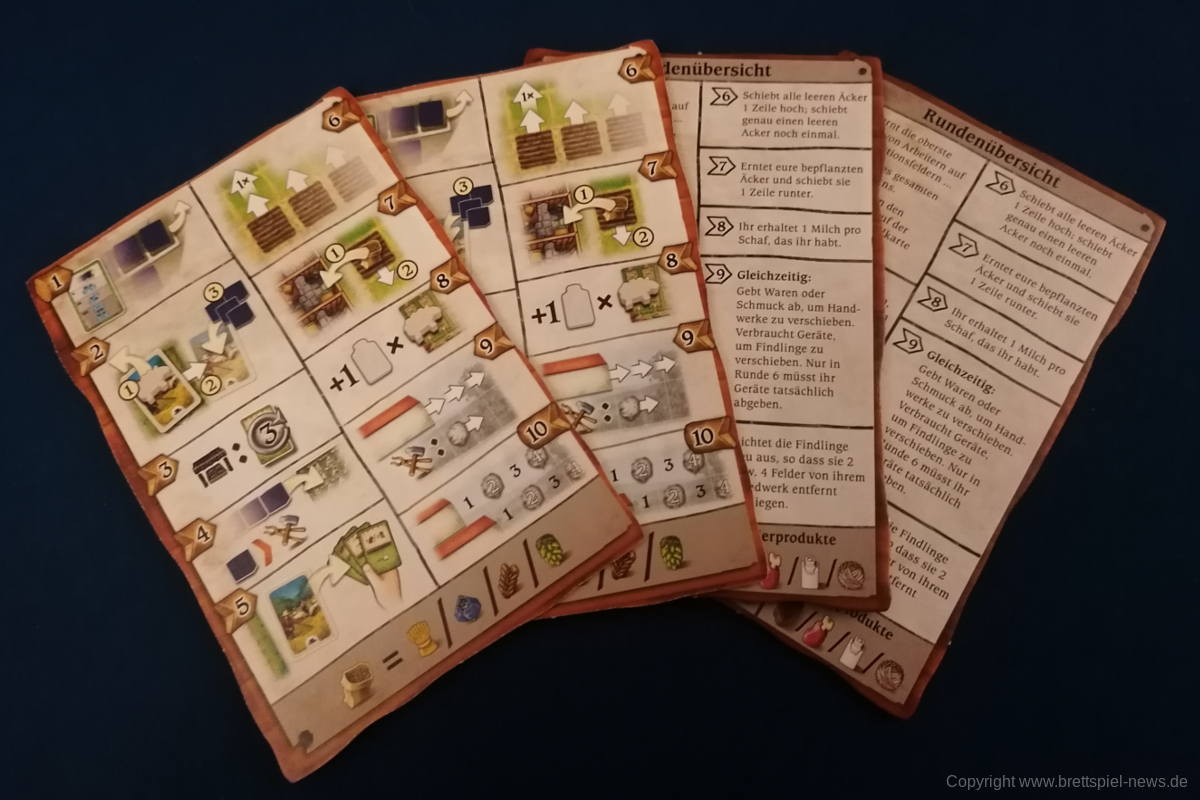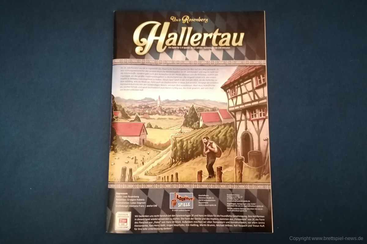HALLERTAU ist ähnlich groß, wie CAVERNA oder FEST FÜR ODIN. Dementsprechend enthält das Spiel sehr viel Material. Neben diversen Spielplänen kommt HALLERTAU mit über 300 Karten und über 200 Holzressourcen, Schafen und Würfeln. Die Anleitung ist ausführlich geschrieben und zeigt viele Beispiele und Bilder. Außerdem gibt es Rosenberg typisch am Ende der Anleitung mit Anhang und Glossar, indem alle Aktionsorte und Karten nochmal erklärt werden. Außerdem sind vier doppelseitige Übersichtplättchen, auf denen die zehn Phasen einer Runde erläuert werden. Einmal mit Text einmal bebildert.