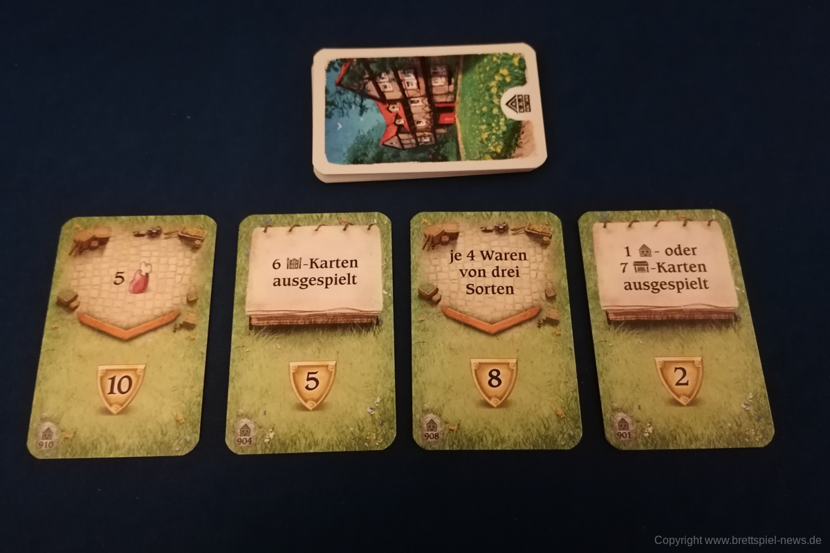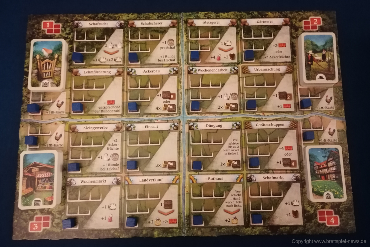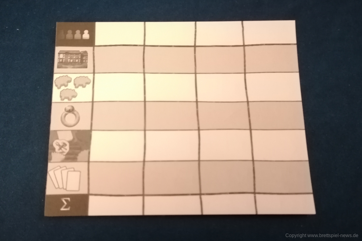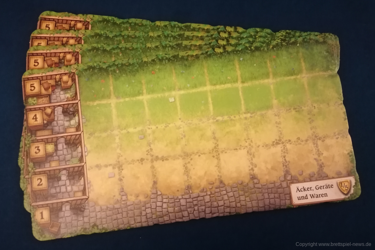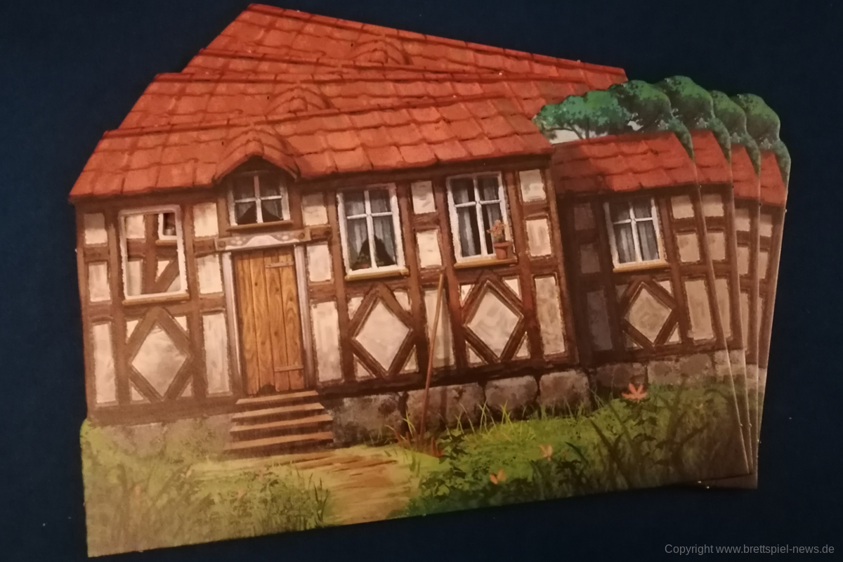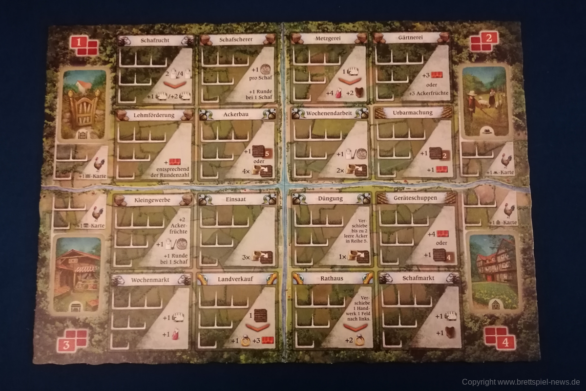 HALLERTAU ist ähnlich groß, wie CAVERNA oder FEST FÜR ODIN. Dementsprechend enthält das Spiel sehr viel Material. Neben diversen Spielplänen kommt HALLERTAU mit über 300 Karten und über 200 Holzressourcen, Schafen und Würfeln. Die Anleitung ist ausführlich geschrieben und zeigt viele Beispiele und Bilder. Außerdem gibt es Rosenberg typisch am Ende der Anleitung mit Anhang und Glossar, indem alle Aktionsorte und Karten nochmal erklärt werden. Außerdem sind vier doppelseitige Übersichtplättchen, auf denen die zehn Phasen einer Runde erläuert werden. Einmal mit Text einmal bebildert.