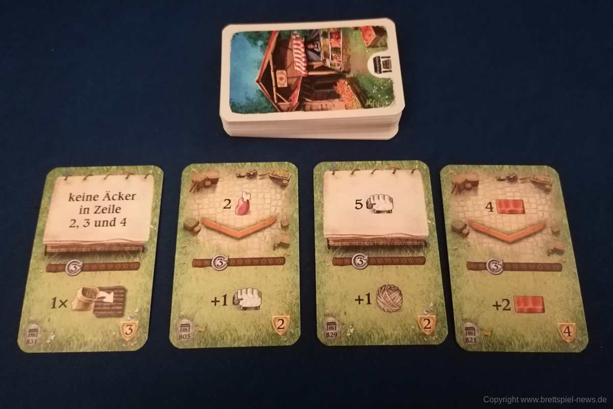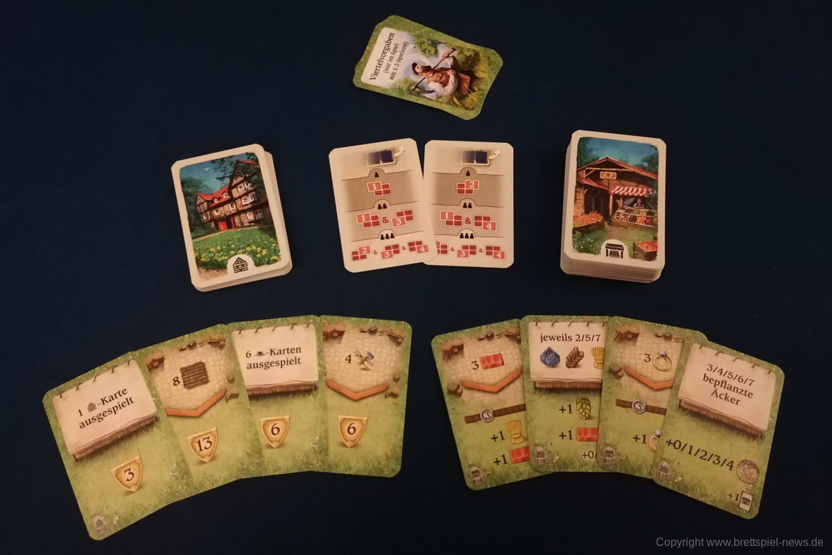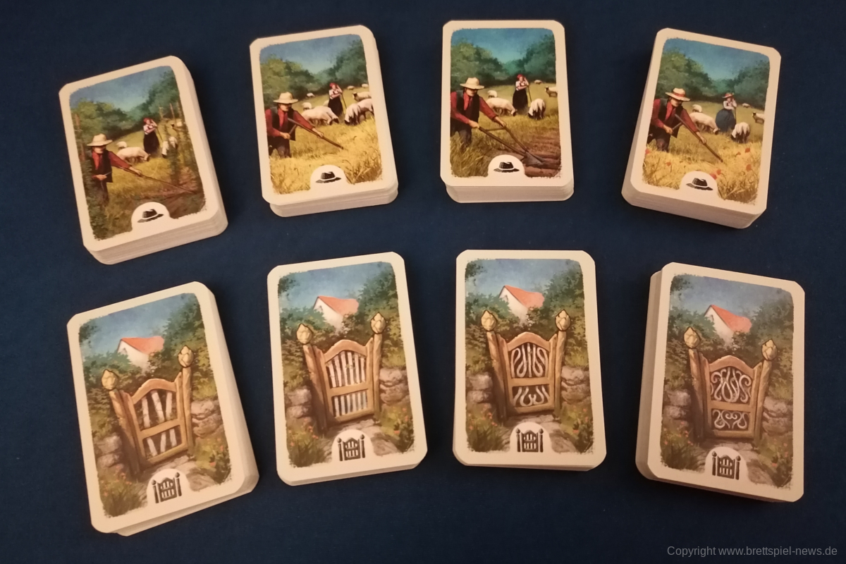 Das Spielmaterial ist, wie von Uwe Rosenberg und LOOKOUT SPIELE gewohnt, hochwertig. Die Tableaus und Karten sind stabil und die Holzressourcen sehen wieder toll aus. Optisch unterscheidet sich Hallertau von den anderen Großen Rosenberg Titeln. Statt Klemens Franz oder Dennis Lohausen, stammen die Illustrationen diesmal von Lukas Siegmon, der bereits REYKHOLT, NOVA LUNA und zuletzt SAGANI von Uwe Rosenberg illustriert hat. Die Einstiegs- und Hofkarten sind in jeweils vier Decks unterteilt. Die Rückseiten unterscheiden sich alle leicht. Mir persönlich wäre eine deutlichere Kennzeichnung der Decks lieber. Insgesamt ist die Ikonografie auf den Karten sowie dem Spielplan sehr klar und hilft für den Einstieg in das Spiel.