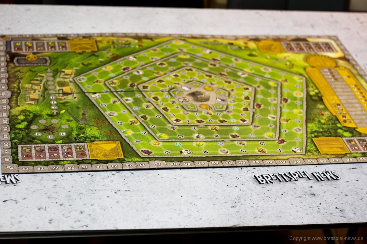 Auf dem Spielbrett befindet sich ein Hügel in der alten Inka-Hauptstadt Cusco, dessen Seiten terrassenförmig angelegt und in fünf Abschnitte unterteilt sind. Auf der Spitze des Hügels befindet sich die Coricancha, der Goldene Tempel, der wichtigste Tempel des Inkareichs.