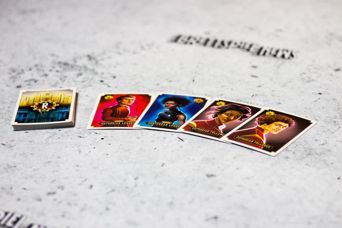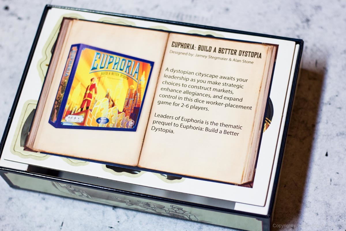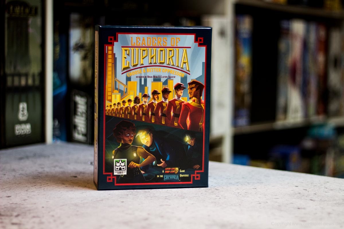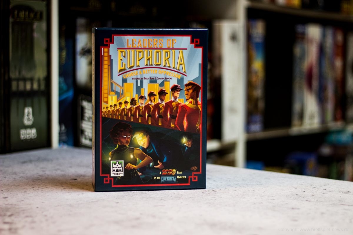 2017 ist die das Kartenspiel LEADERS OF EUPHORIA erschienen. Wir haben uns ein Exemplar besorgt, das im Handel vergriffen ist. Das Spiel ist für 4-8 Spieler ausgelegt, eine Partie soll schnelle 15-30 Minuten dauern. LEADERS OF EUPHORIA basiert auf dem Spielprinzip von A GOOD COP BAD COP und ist nur noch selten verfügbar.