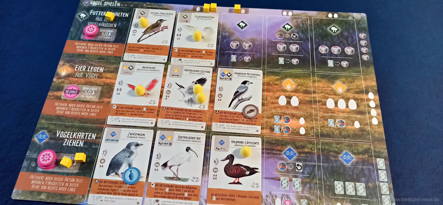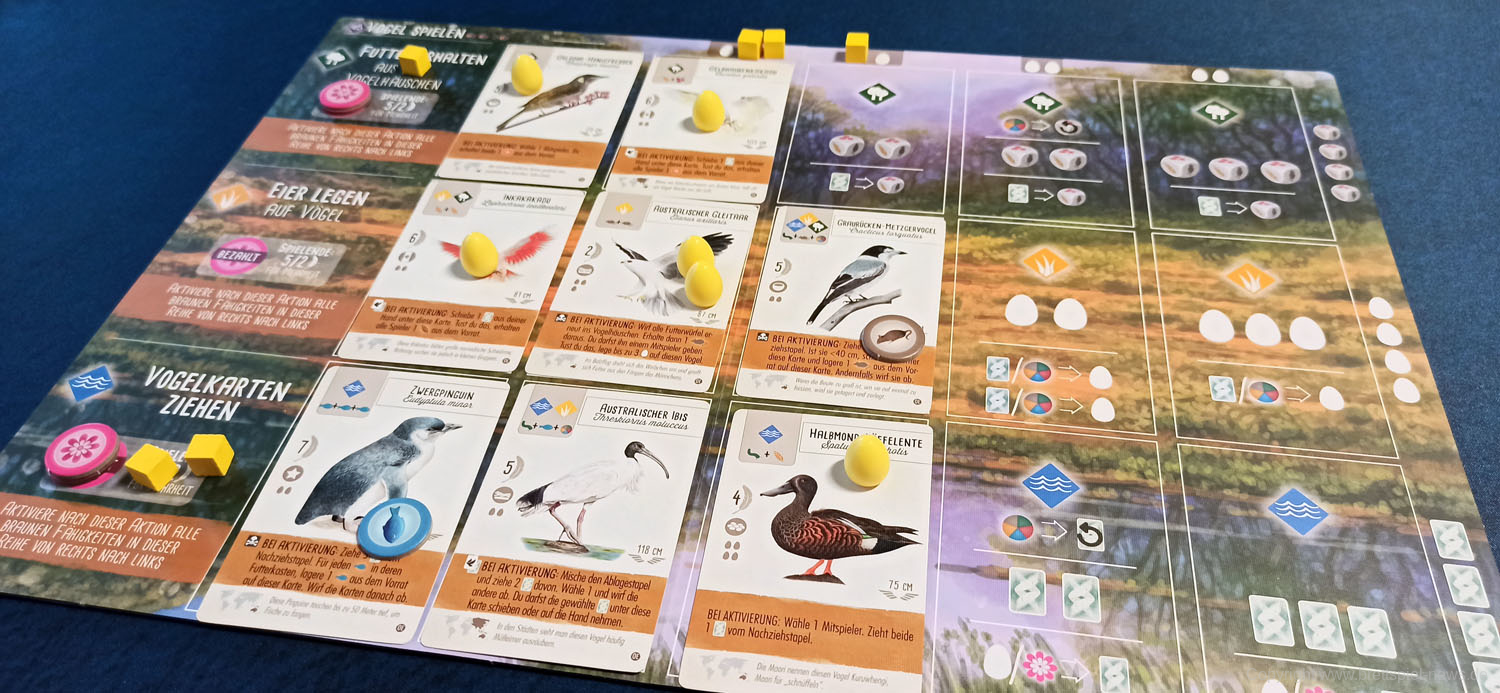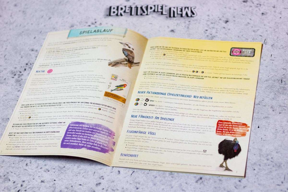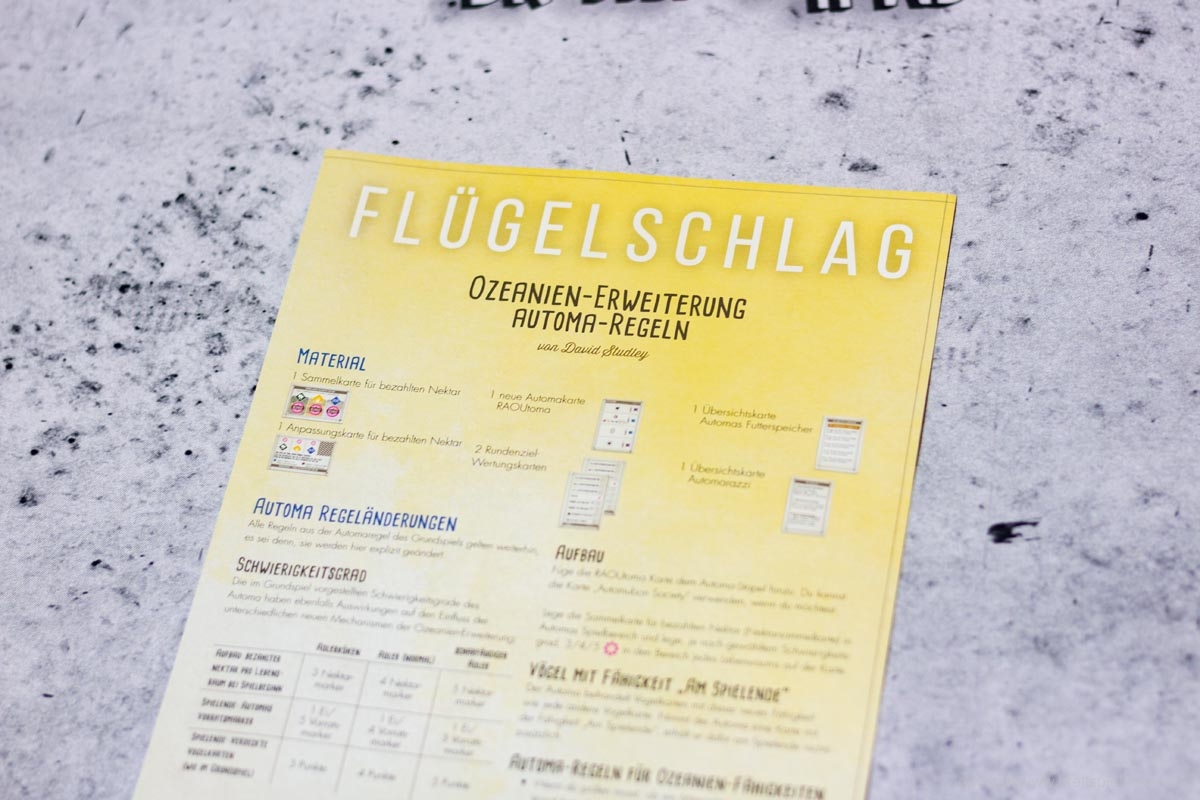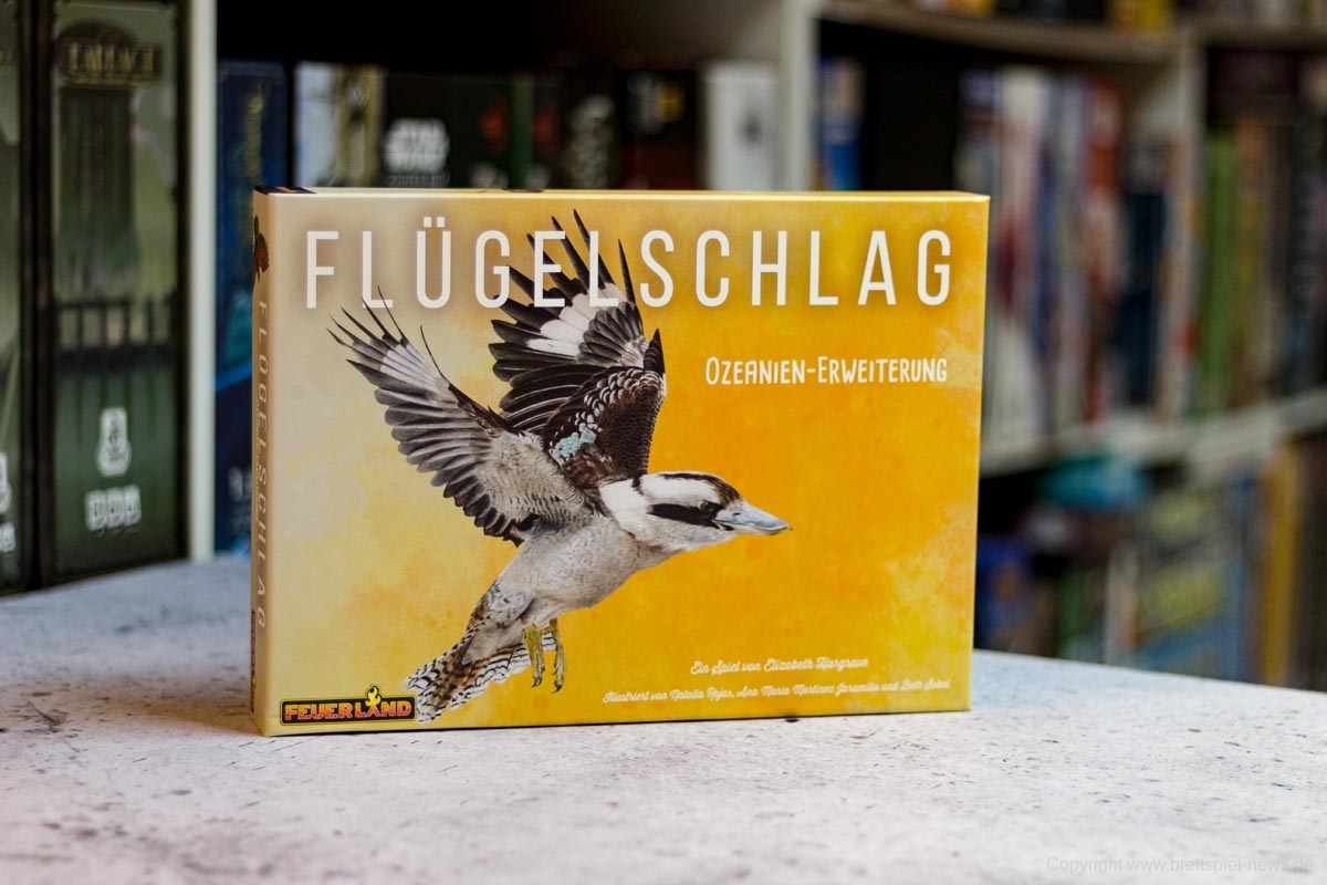 FEUERLAND hat die zweite Erweiterung zu FLÜGELSCHLAG veröffentlicht. Die Erweiterung Oceanien fügt dem Spiel die Vogelwelt aus Australien, Neuseeland und co hinzu. Auf den Bildern sind unter anderem neue gelbe Miniatur Eier, fünf neue Würfel und neue Spieltableaus zu sehen. Für Fans des Spiels sicher ein Pflichtkauf.