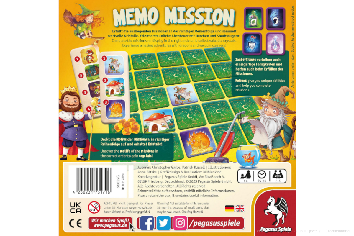 Die UVP von „Memo Mission“ liegt bei 22,99€. Ihr könnt es direkt im Pegasus Shop bestellen, wie auch bei der Spiele-Offensive oder FantasyWelt.