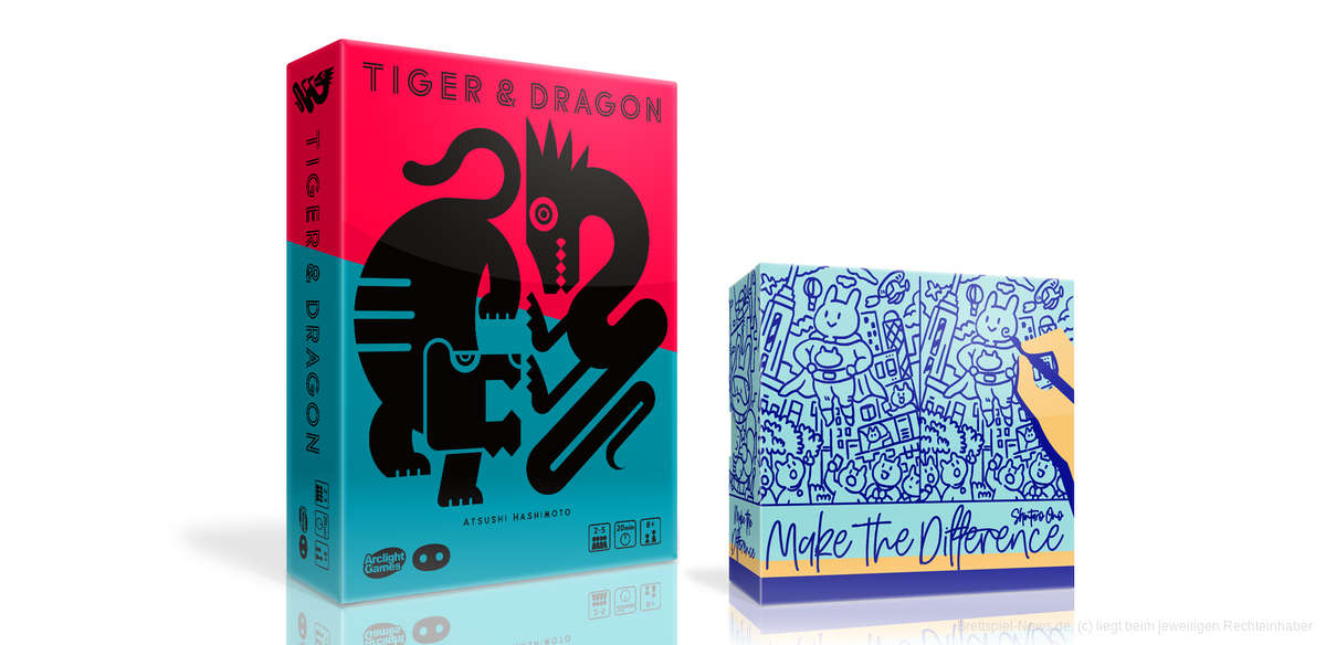 Der japanische Verlag Oink Games ist nicht erst seit dem Erfolg von "Scout" vielen ein Begriff. Viele Spieler und Spielerinnen schätzen die Spiele in den kleinen Schachteln. Für den europäischen Markt wurden jetzt zwei neue Spiele angekündigt „Tiger & Dragon“ und deutsche Version von „Make the Difference“. Beide Spiele sollen auf der Spiel 23 in Essen vorgestellt werden und noch dieses Jahr auf den Markt kommen.