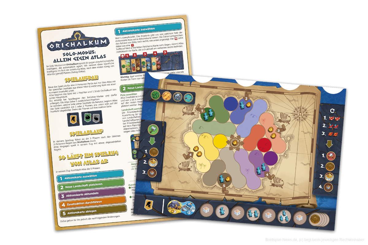 Anfang des Jahres erschien „Orichalkum“ bei Pegasus auf Deutsch (wir berichteten). Das Spiel richtet sich eigentlich an 2-4 Personen ab 10 Jahren. Nun hat Pegasus nachgelegt und in Form der Minierweiterung „Orichalkum: Allein gegen Atlas“ den Solomodus veröffentlicht.