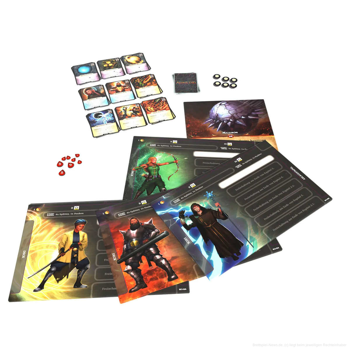 Die Legacy-Elemente bestehen aus Umschlägen mit diversen Überraschungen wie z.B. neuen Karten und Stickerbögen, über die neue Mechaniken und Storyelemente ins Spiel gebracht werden. Im Laufe der Geschichte lernt ihr neue Zauber, erhaltet neue Fähigkeiten, findet Kristalle und Artefakte, um eure Rissmagier immer besser auszurüsten.
