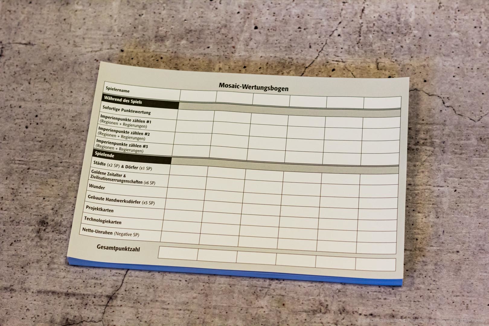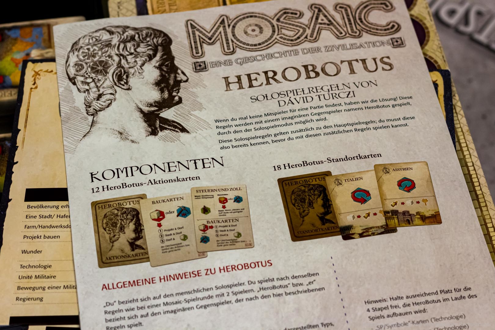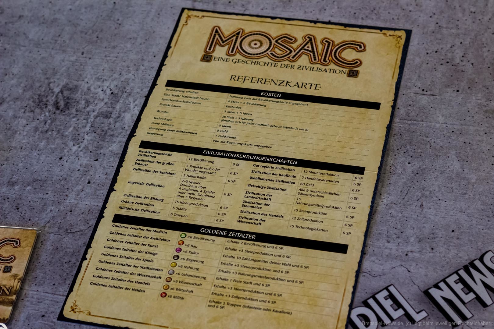 Mosaic ist ein Aktionsauswahlspiel. Wenn Sie am Zug sind, führen Sie eine von acht Aktionen aus und erwerben Säulen der Zivilisation.