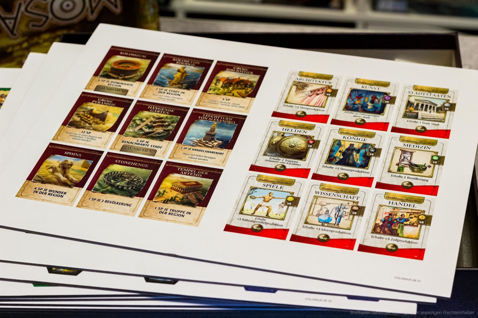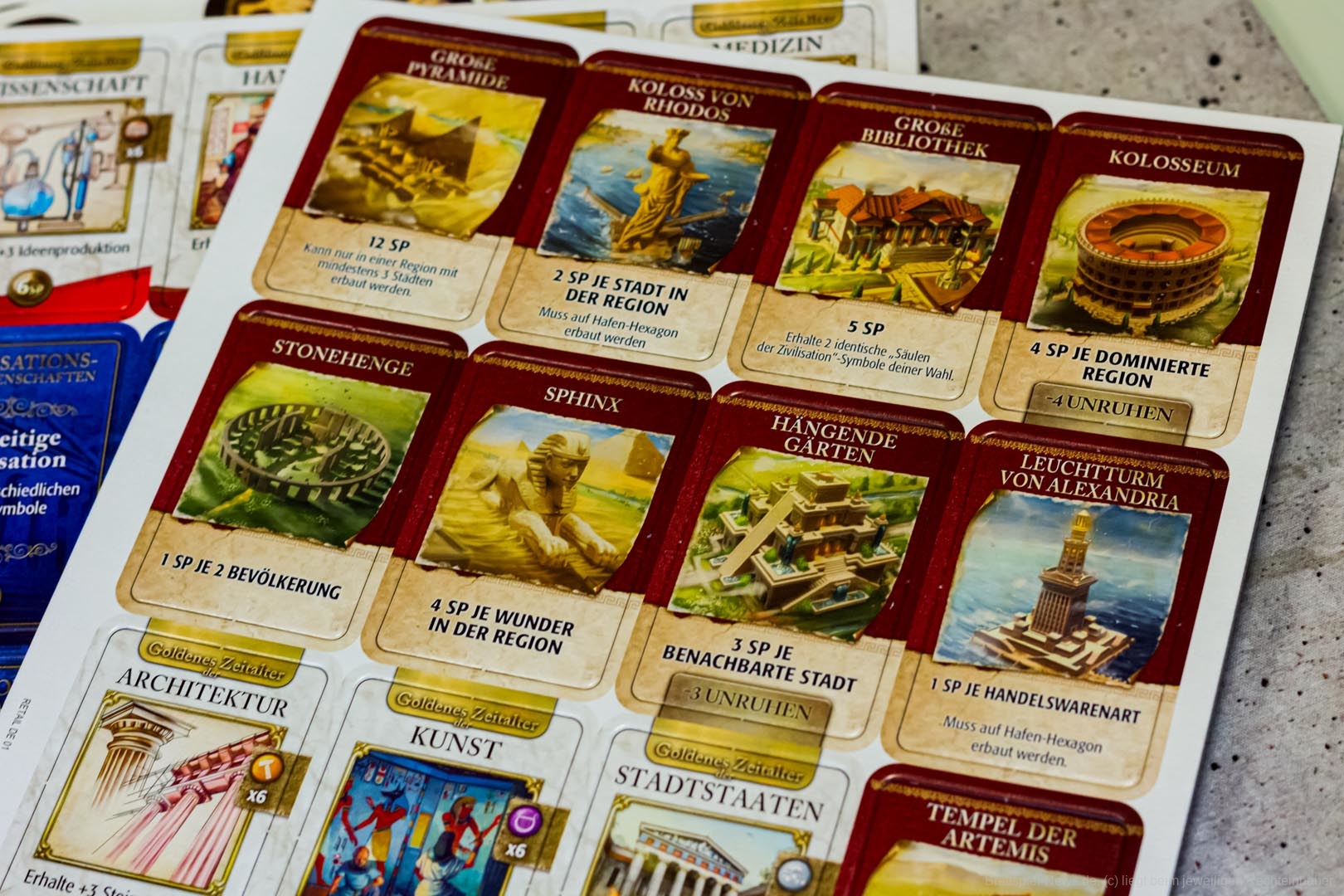 Im Laufe des Spiels und der Entwicklung Ihrer Zivilisation werden schließlich Wertungskarten von den vier Stapeln aufgedeckt. Jedes Mal, wenn eine Wertungskarte aufgedeckt wird, erhält Ihre Zivilisation Punkte für jede Region, die Sie mit Ihren Städten, Ortschaften, Wundern und Militäreinheiten beherrschen. Nachdem die dritte Wertungskarte aufgedeckt wurde, gibt es eine letzte Runde und das Spiel endet. Dann erhältst du Punkte für deine Städte und Dörfer, deine Wunder, Projekte, Errungenschaften und goldenen Zeitalter sowie für alle Karten, die Punkte für deine einzigartigen Zivilisationssäulen bringen.