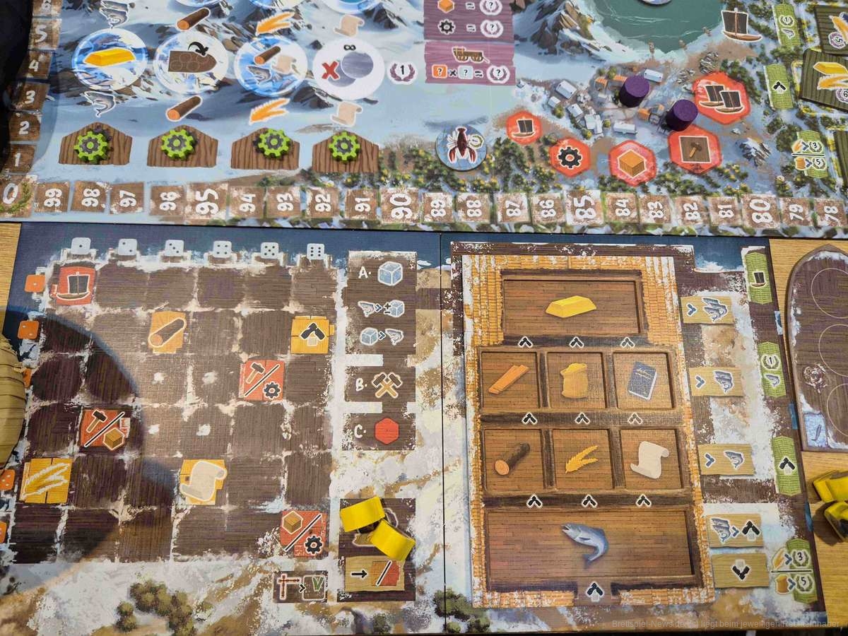 Das Spielbrett der Spieler ist ein Raster, bei dem über drei Runden hinweg geworfene Würfel verschiedene Orte in einer bestimmten Reihe oder Spalte aktivieren. Je mehr Gebäude gebaut werden, desto häufiger können diese Orte im Raster aktiviert werden. Der Würfel wird am Ende einer Spalte oder Reihe abgelegt und macht dieses Segment des Rasters aber für weitere Aktionen unattraktiver. Technologieplättchen gewähren besondere Vorteile, wie das Aufrüsten von Fischerbooten, die in Saltfjord eine zentrale Rolle spielen, um Gebäude zu aktivieren, die Ressourcen liefern und verschiedene Aktionen auslöst, wie das Aussenden von Fischerbooten, das Voranschreiten auf den Technologieleisten, das Erfüllen von Handelsaufträgen oder das Errichten neuer Gebäude.