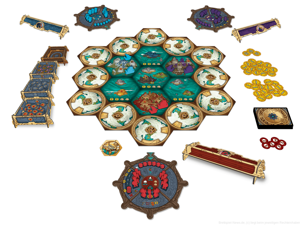 Der Aufbau des Spielfelds erinnert allerdings an das große „Eclipse“. Die Hex-Felder haben Ziffern auf der Rückseite, die je nach Personenzahl anders angeordnet werden. Jede Fraktion hat ihr eigenes Feld mit ihrer Heimatinsel, einem Erkundungs- und einem Kriegsschiff. Und das bleibt auch im Verlauf des Spiels so, man kann keine weiteren Schiffe bauen. Das schränkt Bewegung und Aggressionspotenzial jedoch kaum ein.