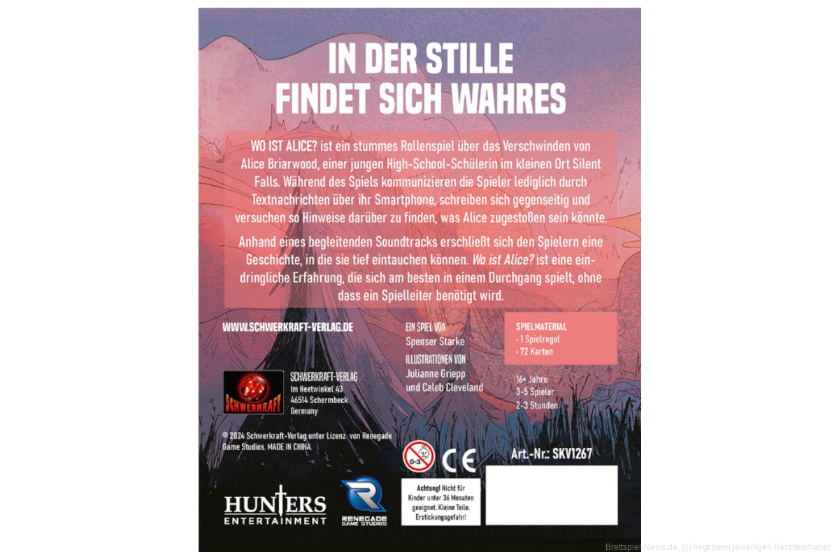 Beim Schwerkraft Verlag ist ab sofort ein sehr innovatives Spiel auf Deutsch erhältlich, das auf BGG mit 8.0/10 sehr gut bewertet ist (wir berichteten bereits über die Ankündigung). „Wo ist Alice?“ ist im Kern zwar ein Rollenspiel. Allerdings kommt es ohne Spielleiter aus und auch ganz ohne verbale Kommunikation.