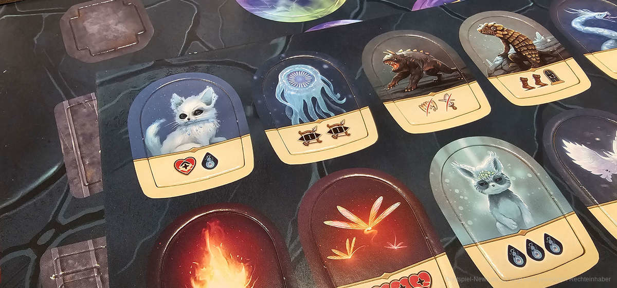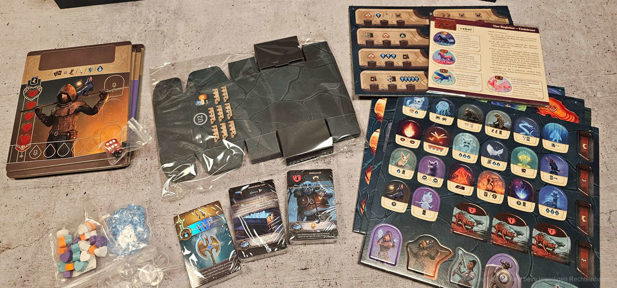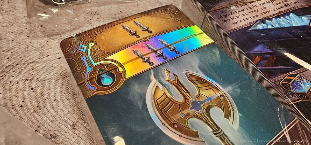 Das Spiel besticht mit seinem Material: Neoprenmatte, Standees, doppellagige Papp-Charakterbögen und Karten mit Holografie-Effekt. Die enthaltenen Faltboxen dienen als Inlay-Ersatz und auch die Mini-Erweiterung “Einhörner” für “Die Chroniken von Avel” liegt bei.