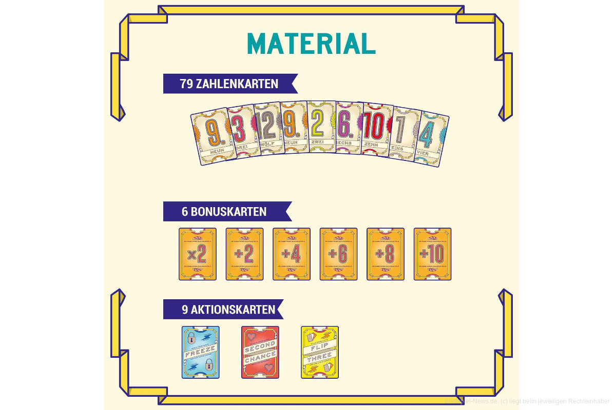 Zusätzlich sorgen Aktionskarten wie „Freeze!“ oder „Flip Three!“ und Bonuskarten für Abwechslung. Besonders spannend wird es, wenn Spieler versuchen, sieben Karten in Folge aufzudecken – der sogenannte „Flip 7“ bringt nämlich Extrapunkte.