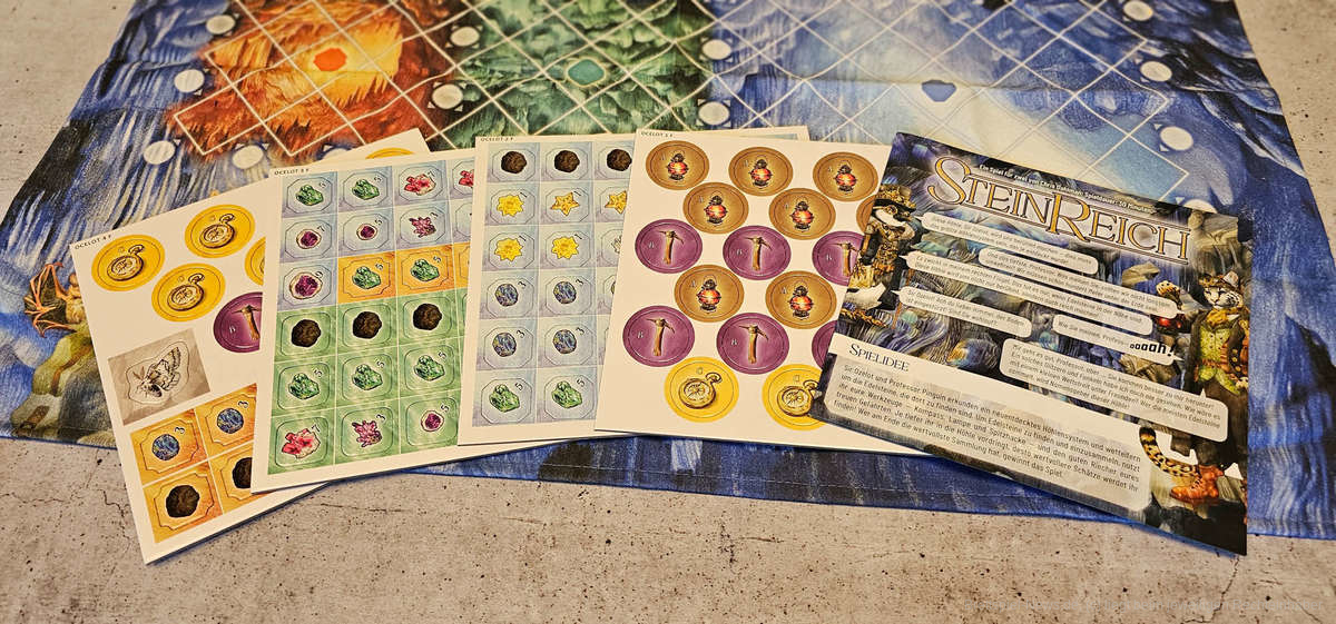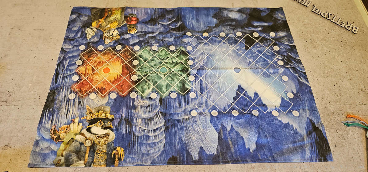 Der Spielplan besteht aus drei Spielflächen, die jeweils eine Ebene der Höhle darstellen und miteinander verbunden sind. Für jede Ebene stehen Höhlenplättchen bereit, welche Edelsteine unterschiedlicher Wertigkeit abbilden und bei Spielbeginn verteilt werden.