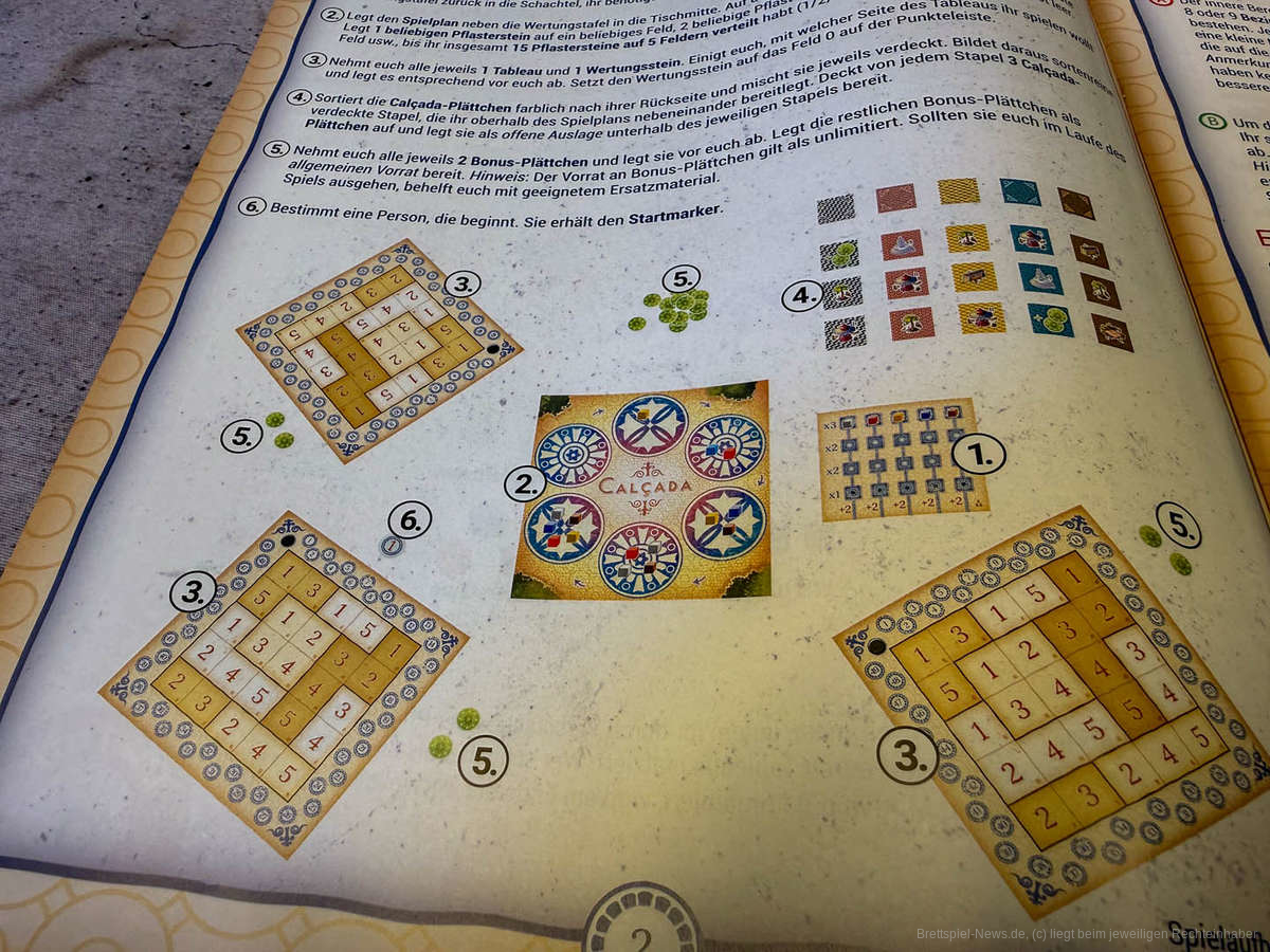 Jeder Spieler startet mit denselben Voraussetzungen. Die identischen Tableaus zeigen Bereiche, in denen gepflastert werden soll. Jeder Bereich besteht aus Feldern mit Zahlen und darf jeweils nur mit einer der fünf Plättchen-Farben belegt werden.